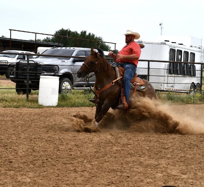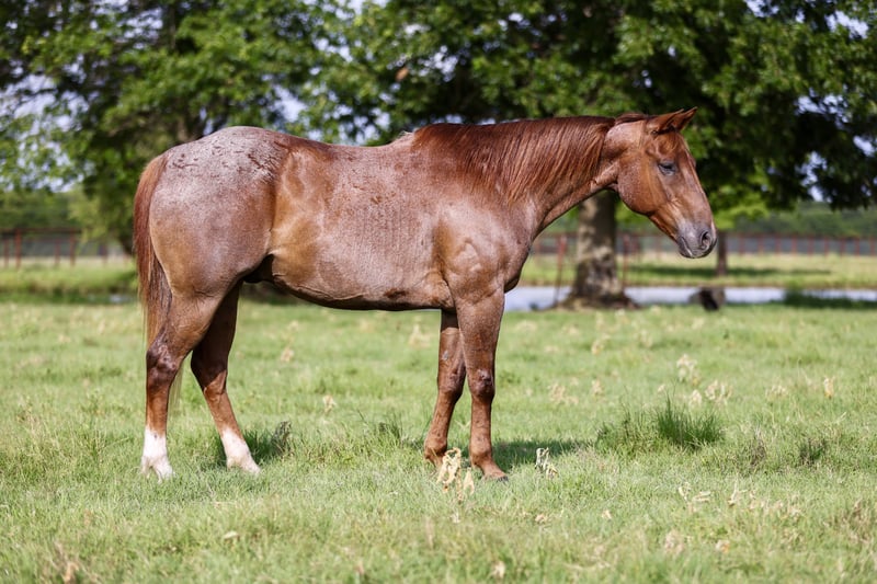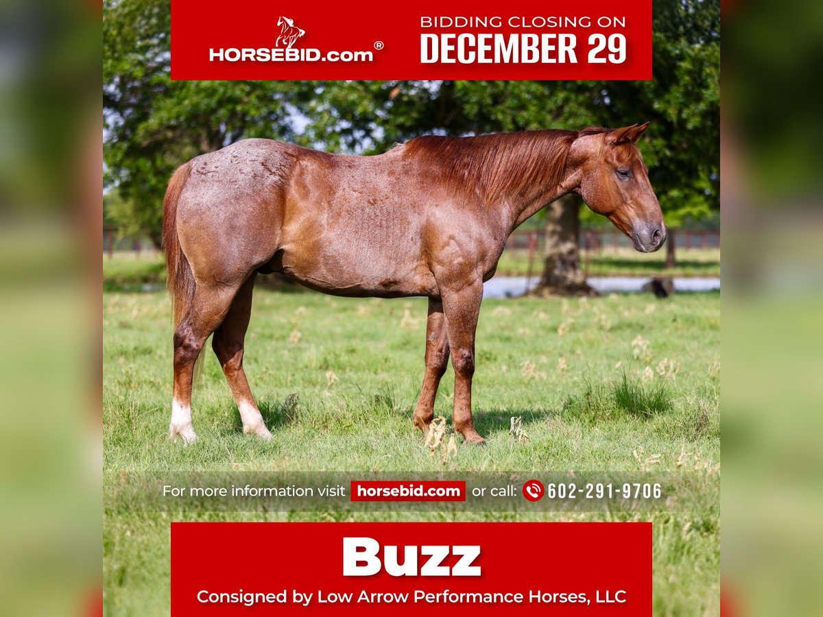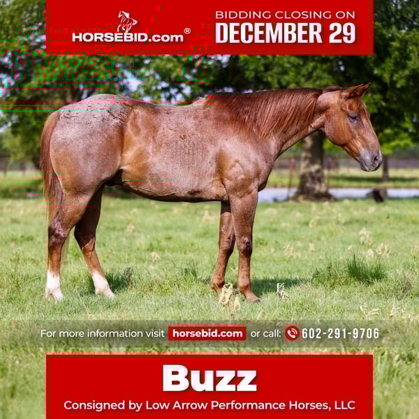 ⚜️𝐓𝐇𝐄 𝓗𝓮𝓻𝓲𝓽𝓪𝓰𝓮 𝐖𝐢𝐧𝐭𝐞𝐫 𝓒𝓵𝓪𝓼𝓼𝓲𝓬⚜️ Happening now thru MONDAY | DECEMBER 29th - Available EXCLUSIVELY on HorseBid's website! For more details and to register visit: www.Horsebid.com CONSIGNOR CONTACT: Low Arrow Performance Horses, LLC 602-291-9706 LOCATION: Stephenville, TX BREED: AQHA REGISTERED: Yes REGISTERED NAME: EM TWO POUNDS COLOR: Red Roan HEIGHT: 15 AGE: 12 GENDER: Gelding If you’re looking for one that turns heads and rides like a dream, here he is. This gorgeous red roan gelding has the looks, the brains, and the training to match. He’s fancy broke with all the buttons—side passes, pivots, soft in the face, collects up, moves off your legs, and lopes beautiful circles. Out on the trail, he’s as solid as they come. He crosses water, bridges, brush, and rough terrain without hesitation. He will ride out alone or in a group and stays quiet and confident either way. We have a 13-year-old who takes lessons on him. A group of kids even painted the American flag on him. She catches him, saddles, grooms him, and rides him all over—both in and out of the arena. He has also packed a 7 & 8yo around safely as well. He was also ridden through Fourth of July parades and through town with no issues. He is a finished head and heel horse. He is quite in the box. He scores great and leaves flat. He has gotten a little fresh a time or two in the roping pen but remains solid and consistent overall. This gelding is the total package—broke enough for the arena, safe enough for the trails, and pretty enough to get noticed anywhere you take him. He’s the kind you’ll be proud to own and enjoy every single day. Buzz loads and hauls great. He is easy to groom, bathe, and saddle. He will stand tied quite all day along. Overall has outstanding ground manners. Buzz is an easy keeper and low maintenance. He has a good shapey build to him. He is a little over on his front left knee. AQHA papers are in order and ready for immediate transfer. A bill of sale will be completed via DocuSign at the conclusion of the sale, and the buyer will receive a detailed care log to ensure a smooth transition into his new home. Interested buyers are welcome to fly in and try him in person. FaceTime appointments are also available for out-of-state buyers. Assistance with arranging professional shipping anywhere within the United States is available! Please call with any questions 602-291-9706
