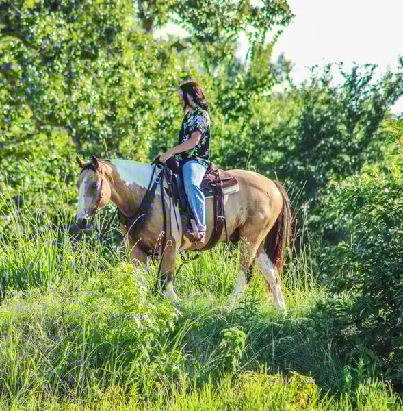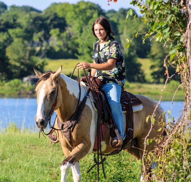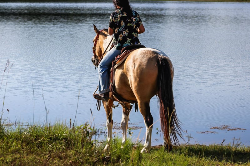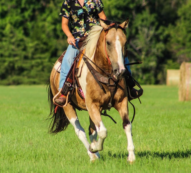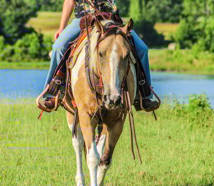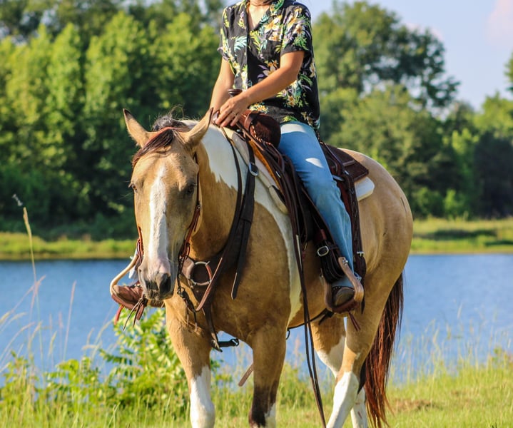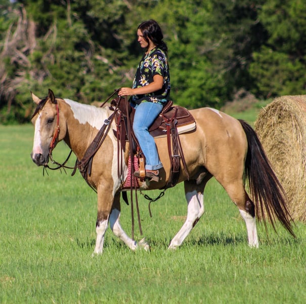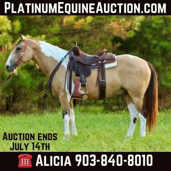 ONLINE AUCTION Place your bids at www.PlatinumEquineAuction.com Starting Bid $3500 Auction ends July 14th, 2024 Need a new saddle? Check out White Rock Saddles on our website or Facebook! Check out Flounder if you are looking for your next flashy partner to hit the trails with you need to meet Flounder. He is an 11 year old gelding who stands the perfect size of 14.2 hands tall. Flounder is stout built with good bone and feet. He has a buckskin base coat with some of the prettiest paint markings! He is gorgeous and gets tons of compliments everywhere he goes. Not only is Flounder a handsome guy he is also very well mannered. He stands tied. Loads in any trailer. Stands for shoes and cleaning his feet. He is good to take baths and eats up attention. He really loves people and will meet you to catch him anywhere you find him. Flounder has seen many ranch and trail miles all over Texas and Oklahoma. He is safe around traffic, dogs, noises. He will not think twice about crossing a bridge and he LOVES water. You won’t ever have to tell him twice to go in water. We have swam him in ponds and it’s one of his favorite things to do. Flounder has a good handle and huge stop. He likes to go slow but he does know how to kick it up a notch and will lope right out of his tracks if you ask him to. He will never go any faster than you want him to. Flounder is not only a seasoned ranch and trail horse but he’s done many playdays and fun shows. If you are interested in more information on Flounder please call me anytime Alicia Darling 903-840-8010 Located in Willis Point, TX. ONLINE AUCTION Place your bids at www.PlatinumEquineAuction.com Starting Bid $3500 Auction ends July 14th, 2024 Need a new saddle? Check out White Rock Saddles on our website or Facebook!