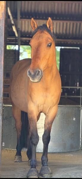 Taris Stepjac Dr No – a 2012-born Quarter Horse gelding standing approximately 150 cm (14.3 hh). He has a striking dun color and impresses with his compact, muscular build and a particularly people-oriented, sensitive character. Tari does not have a pedigree certificate but comes with a passport and has been tested genetically as 5-Panel n/n. He has been ridden Western-style but is currently not in training. At the moment, he is receiving extensive groundwork, during which he shows a willing and attentive attitude. He feels comfortable in the field, is confident there, and can be ridden alone. Tari is well-behaved in handling, familiar with herd life in a mixed herd in open stable management, and also adapts well to box stall housing—though he prefers the open stable environment. He is calm with veterinary treatments and farrier work, regularly dewormed, vaccinated, and annually checked by the veterinarian. Health-wise, Tari has a diagnosed hind limb laminitis, with X-rays available. Therefore, he requires appropriate laminitis-friendly shoeing. Additionally, he is a cribber but copes well with this behavior. It is important to note that he is not suitable for beginners or children. Tari needs an experienced rider who works with him sensitively, challenges him appropriately, and supports his development. He may occasionally buck in certain situations. Tari is only to be placed in loving, competent, and experienced hands—price is secondary to finding the right home. A good, caring environment is of utmost priority.