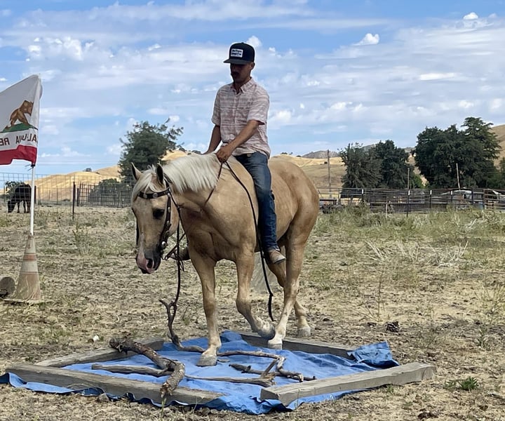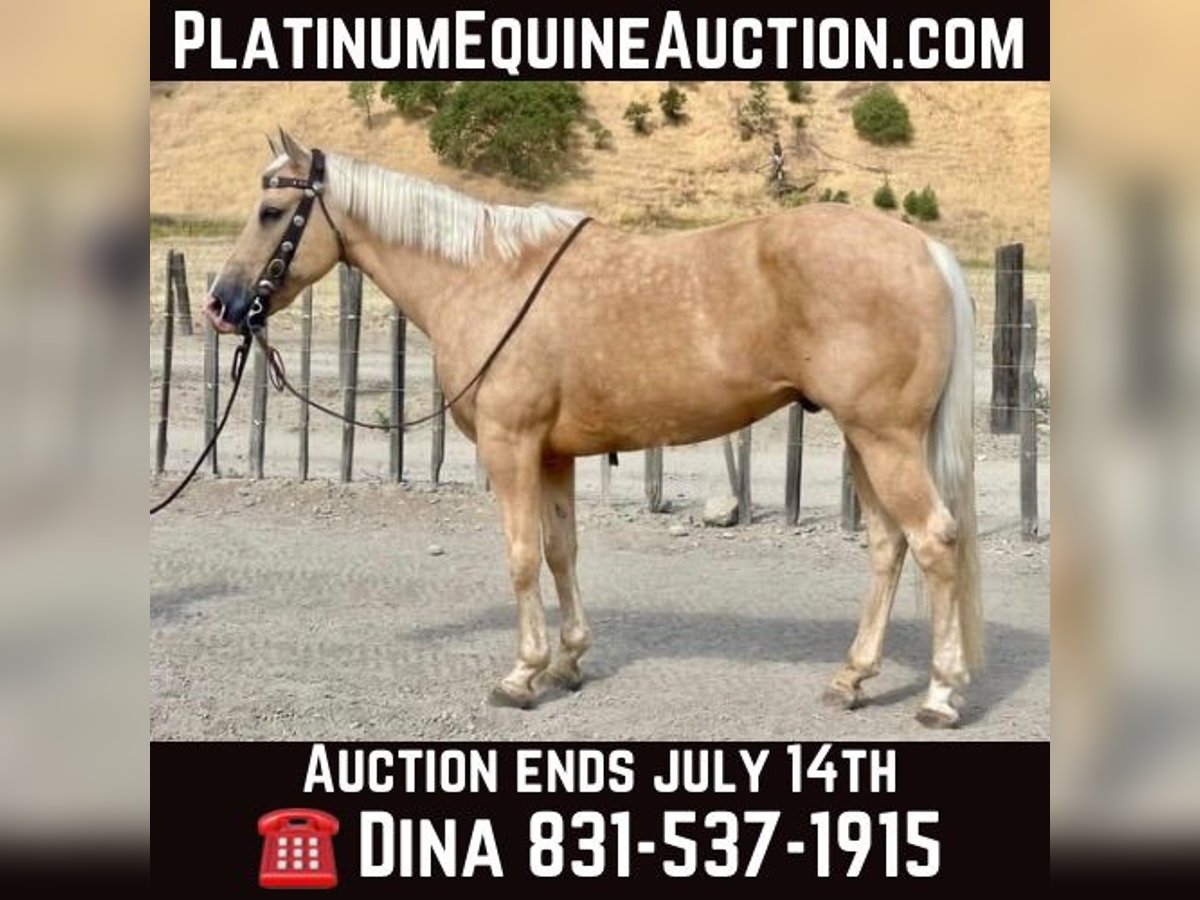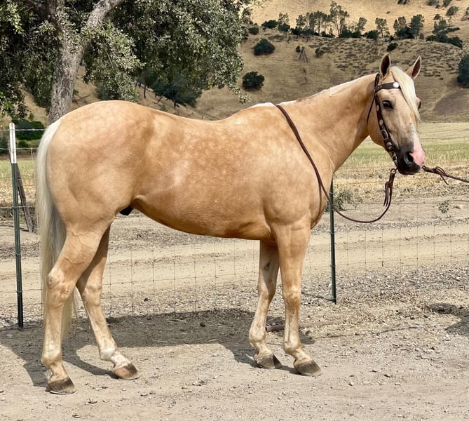 ONLINE AUCTION Place your bids at www.PlatinumEquineAuction.com Starting Bid $3500 Auction ends July 14th, 2024 Need a new saddle? Check out White Rock Saddles on our website or Facebook! Butter is a horse that will melt your heart with his sweet disposition and kindness. He is 12 year old, 15 hand, fancy eye catching golden boy. This is one of the easiest horses to ride and is absolutely magnificent. He is extremely calm and capable of doing anything you can ask. He is a superb trail mount with his no nonsense attitude and approaches everything with confidence and gentleness. Whether you want to hit the town with friends or take a scenic stroll around the neighborhood you can count on butter to be reliable and safe. This horse is VERY unflappable and will go absolutely anywhere. He will cross the deepest water, navigate narrow trails, walk over downed trees, and has seen tons of wildlife. There will be nothing that he hasn’t seen. Butter will navigate any obstacle with ease and quietness. He has seen swinging balls, flying tarps, crosses bridges, logs, carries flags you name it he can do it. He is unfazed by cars, trucks, road work, and even statue dinosaurs. He is professionally broke in the arena will maintain his quiet easy going disposition. He will have correct circles, with a nice collected headset to match his smooth as butter transitions in his movements. He is one you can trust with all level riders. He is the whole package! AARP approved. He is a solid ranch gelding who has taken the most delicate riders out and will babysit them but is so versatile that the top hand can do any task on him. Butter has been started roping and is doing great. He is the perfect horse to learn and grow on. He will take care of his rider and will adjust himself accordingly. This horse is a saint and truly irreplaceable. He has been a joy to have the pleasure owning and will be missed. Butter has the ability to teach and help build confidence to new riders which makes him a remarkable family horse. Butter is great to be around great for veterinarian visits, stands patiently tied. Loves to be groomed, and enjoys being around his people. He is very polite and respectful. Butter has so much to give with his knowledge and kindness. He will ride bareback, double and in halter with ease. He is easy to trailer, good with other horses, and pastures or stalls nicely. I cannot say enough good things about this horse he is one of a kind. Butter is definitely a universal horse that anyone can easily ride. There is so much he has to offer making him one you don’t find available often. If you would like to come meet me Butter please contact Longhorn Ranch Dina 831-537-1915 Located in Paicines, CA. ONLINE AUCTION Place your bids at www.PlatinumEquineAuction.com Starting Bid $3500 Auction ends July 14th, 2024 Need a new saddle? Check out White Rock Saddles on our website or Facebook!