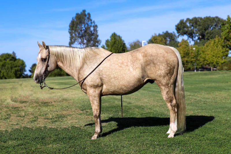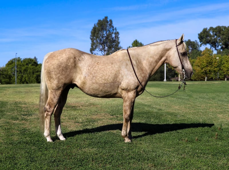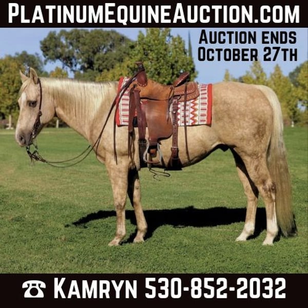 ONLINE AUCTION Place your bids at www.PlatinumEquineAuction.com Starting Bid $3500 Auction ends October 27th, 2024 Need a new saddle? Check out White Rock Saddles on our website or Facebook! Introducing Cheerio, a breathtaking 12-year-old, 15-hand dappled palomino gelding. This horse is as beautiful as he is kind, with a heart of gold and a temperament that makes him an absolute joy to be around. Cheerio is the whole package—uncomplicated, easy to handle, and versatile in both trail and arena work. If you’re looking for a horse that does it all with grace and ease, Cheerio is your guy. Cheerio is the definition of a trail horse deluxe. He’s experienced and confident, always ready for an adventure, whether you’re riding through scenic paths or more challenging terrain or through town. He handles water crossings, bridges, logs, steep hills, and rocky trails like a seasoned pro. No matter what’s ahead, Cheerio tackles it with calm and steady composure. He loves exploring the outdoors, making him the perfect partner for long, relaxing trail rides or more ambitious rides through varying terrains. Cheerio has been through just about every obstacle you can imagine and never hesitates to face new challenges. Whether it’s pool noodles, tarps, teeter-totter bridges, swaying bridges, water bottles, or even waterfalls, Cheerio confidently navigates through anything you point him at. His calm and steady nature shines, making him an ideal horse for competitive trail riding, obstacle challenges, or simply a reliable partner for exploring unpredictable environments. Not only is Cheerio a trail superstar, but he’s also a dream in the arena. He knows his leads, has an incredibly smooth and easy trot, and transitions between walk, trot, and canter effortlessly. His gaits are comfortable to ride, and his canter is smooth and collected, making him enjoyable for riders of all levels. He’s more of a “woah” than a “go,” meaning he’ll walk, trot, and canter on a loose rein without rushing, making him perfect for those who prefer a laid-back ride. His stop comes right off your seat, making him a reliable and responsive horse whether you’re working in the arena or on the trail. Cheerio has the kind of ground manners that make him an absolute saint to handle. He stands like a rock for the farrier, grooming, saddling, and bathing—he’ll even doze off during it! His calm demeanor extends to every situation, whether it’s around dogs, loud noises, smoke, tractors, ATVs, or heavy equipment. He’s unphased by wildlife, cows, or other distractions, making him an excellent partner for riders who need a horse with a bombproof attitude. Loading Cheerio into a trailer is a breeze. He steps right in and out. Don’t miss out on Cheerio he’s definitely one you’ll want in your barn. Located in Pleasant Grove, CA. Contact KW Ranch and Performance Horses Kamryn 530-852-2032. ONLINE AUCTION Place your bids at www.PlatinumEquineAuction.com Starting Bid $3500 Auction ends October 27th, 2024 Need a new saddle? Check out White Rock Saddles on our website or Facebook!