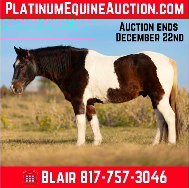 ONLINE AUCTION Place your bids at www.PlatinumEquineAuction.com Starting Bid $3500 Auction ends December 22nd, 2024 Need a new saddle? Check out White Rock Saddles on our website or Facebook! Barnaby is a 13 yr old 14.1 hand bay roan and white paint gelding that everyone is sure to fall in love with! If you need one that rides like a COUCH, this guy is for you!! He is absolutely comfortable at all gaits and his lope is like riding a stick of butter! He has spent his days raising up kids that are now ready to move onto the step up performance horses. Barnaby is gentle gentle gentle and if you can hold the reins you can ride him! He’s broke like one should be which will make the beginner kids fall in love with riding! He neck reins with ease and moves off leg great! He has all the buttons, picks up both leads and stops right when you ask him to! He was used for play days, trails, pleasure rides and he has also pushed cows and roped the dummy! Barnaby would be the perfect kids play day horse, lesson horse or trail horse for any novice rider, older rider, or beginner that’s looking for a safe mount! He has absolutely ZERO buck bolt or rear and is easy to get along with in all aspects! He loads, leads, bathes and ties like a saint and he is UTD on teeth, feet and coggins! He has a huge loving personality and is sure to make anyone he meets smile! Barnaby is has a really cool bay roan color and definitely stands out from the rest! He has everything going for him that you could ever need in a beginner / kid safe / trail horse! Don’t miss this COMFY, easing going guy the whole family is sure to love! Watch his FULL video and go to his website page northtexashorsecompany.com/barnaby for more pictures and footage! Please call Blair with North Texas Horse Company for more info at 817-757-3046. We LOVE to talk about him! We are located in Weatherford, TX and can help arrange affordable shipping to anyone!! ONLINE AUCTION Place your bids at www.PlatinumEquineAuction.com Starting Bid $3500 Auction ends December 22nd, 2024 Need a new saddle? Check out White Rock Saddles on our website or Facebook!