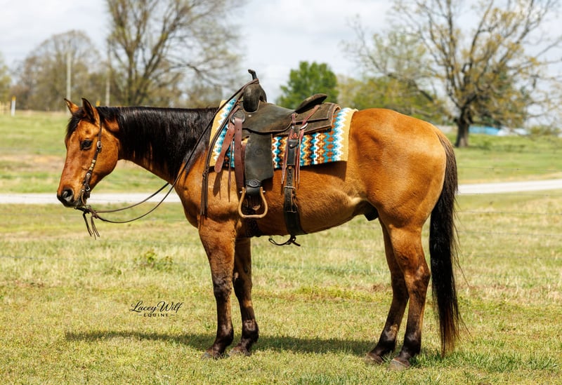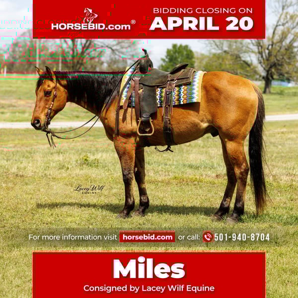 ⚜️𝐭𝐡𝐞 𝓔𝓵𝓲𝓽𝓮 𝐒𝐩𝐫𝐢𝐧𝐠 𝐂𝐥𝐚𝐬𝐬𝐢𝐜⚜️ Happening now thru MONDAY | APRIL 20th - Available EXCLUSIVELY on HorseBid's website! For more details and to register visit: www.Horsebid.com CONSIGNOR CONTACT: Lacey Wilf Equine 501-940-8704 LOCATION: Quitman, AR BREED: Quarter Horse REGISTERED: Yes REGISTERED NAME: DELIGHTFUL MILES COLOR: Dun HEIGHT: 15.2 AGE: 15 GENDER: Gelding Delightful Miles, known simply as Miles, is a 2011 model dun Quarter Horse gelding standing 15.2 hands, presenting himself with a quiet confidence that only comes from a life well ridden and thoughtfully experienced. He represents the kind of steady, intentional development that produces a horse with substance, feel, and lasting usability. The miles behind him are evident in every step, shaping a gelding that is steady, composed, and exceptionally user-friendly. On the trail, Miles is as reliable as they come. He travels out with intention and ease, confidently navigating water, uneven terrain, timber, and the kind of real-world obstacles that define a truly seasoned horse. Whether riding out alone or in company, he remains level-headed and consistent, offering a smooth, enjoyable experience that invites you to sit back and appreciate the ride. In the arena, he carries himself with polish and purpose. Miles has a correct, balanced way of going, picks up both leads with ease, and stays soft through the bridle and body. His handle is honest and uncomplicated, allowing for a ride that feels natural and connected without ever being demanding. He moves with a quiet presence that translates seamlessly into the show pen, where he has proven himself in both trail classes and ranch horse classes, showcasing his versatility and composure in a refined setting. Beyond his performance, Miles is a pleasure in every aspect of daily life. He is kind, respectful, and easy to manage, whether bringing him in from the pasture or handling him around the barn. He settles effortlessly into routine, doing equally well stalled or turned out with other horses, and carries a demeanor that makes him as enjoyable on the ground as he is under saddle. Miles comes with a refined, balanced conformation, carrying strong bone, a well-shaped shoulder, and a hip that gives him both presence and purpose in his movement. He is also 5 panel negative. Miles does carry a small cosmetic scar on his right hind ankle that is almost completely unnoticeable and does not affect him whatsoever. With his thoughtful disposition, proven experience, and understated elegance, Miles is the kind that offers not just ability, but a feeling, one that is steady, reliable, and quietly exceptional.