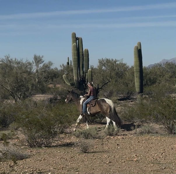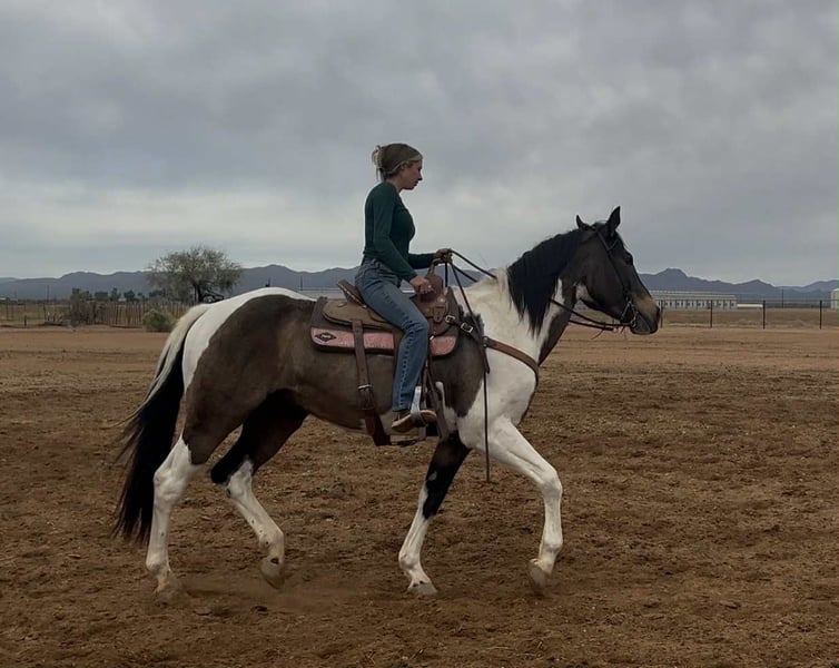 ONLINE AUCTION Place your bids at www.PlatinumEquineAuction.com Starting Bid $3500 Auction ends January 4th, 2025 Need a new saddle? Check out White Rock Saddles on our website or Facebook Flashy and sweet!! Mickey is a gorgeous 15 year old buckskin paint gelding standing a stout 15.3 hands tall wearing a size 1 shoe. Mickey is a finished head horse, he is good in the box, scores well, and knows his job when it’s time to rope. He has been hauled to jackpots and would also make a great practice horse at home. He neck reins, has a good stop, and is responsive and moves off your leg very well. He is more go than woah but doesn’t have a mean bone in him. Mickey has also been trail ridden and is happy to go out alone or with others. He’s been used on the ranch to push cattle and check fence. On the ground Mickey is a total love bug. He always has his head over his stall waiting for attention and love from his people. He stands tied, bathes, loads and hauls well. He gets along great with other horses and is even stalled next to our stallion here. Mickey would do best with a quiet and confident rider as he is responsive to your aids and not a dull type of horse. He is sound with no maintenance. Mickey does have a very mild sway back, but it does not affect his soundness or performance at all. This sweet boy is ready to be someone’s number one best friend! He is located in Marana, Arizona and we are happy to help arrange transport anywhere for him. Please feel free to call or text Claire Siebols with any questions about Mickey at 435-899-0508 ONLINE AUCTION Place your bids at www.PlatinumEquineAuction.com Starting Bid $3500 Auction ends January 4th, 2025 Need a new saddle? Check out White Rock Saddles on our website or Facebook