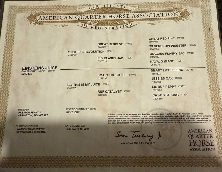 ONLINE AUCTION Place your bids at www.PlatinumEquineAuction.com Starting Bid $3500 Auction ends July 13th 2025 Need a new saddle? Check out White Rock Saddles on our website or Facebook! Meet Einsteins Juice, affectionately known as Clyde! This 2009 AQHA gelding stands at a sturdy 14.2 hands tall, and don’t let his age fool you—he’s got plenty of adventures left in him! Clyde is truly the complete package, boasting a pedigree filled with champions. He’s an own son of Einsteins Revolution, a renowned NRHA million-dollar sire. Clyde is a seasoned veteran with a heart of gold. He’s a finished heel and breakaway horse who has traveled all over the country for rodeos and jackpots, and he’s seen it all! I don’t often use the term “bombproof,” but Clyde truly deserves that title. Whether you’re ranching or just enjoying a day out, he’s got you covered. He’s great for all ranch chores and rides out anywhere with a nice, easy stride. Clyde loves hitting the trails and has no hesitation when it comes to swimming—he’ll walk right into any water! He’s confident on various terrains, and will cross logs, bridges, or tarps. You can even ride him bridle-less down the trails or through the pasture, which speaks volumes about his trustworthiness and training! Clyde has proudly carried flags at multiple rodeo grand entries, showcasing his calm demeanor and versatility. He’s the perfect addition to any family—gentle enough for everyone, from kids to adults. While he might not have a flashy color, being a plain sorrel, Clyde is the horse that 95% of horse seekers are looking for. He’s an absolute gentleman and the sweetest guy around. If you’re looking for a reliable and fun partner, Clyde is ready to steal your heart! Come meet him and see for yourself what a wonderful companion he can be! He does have a cosmetic wire scar on his right front leg. It does not bother him at all it’s just there. We are open to anyone interested in him to schedule a time to come see him or if you can’t make it schedule a FaceTime showing to see him. If you need help with transport don’t hesitate to ask we have a list of reputable haulers that can get him safely to your doorstep WORLD WIDE including, Alaska , Mexico, Hawaii, Canada and anywhere in between. Contact M$ Performance Horses Michelle 661-817-9120 with nay questions. ONLINE AUCTION Place your bids at www.PlatinumEquineAuction.com Starting Bid $3500 Auction ends July 13th 2025 Need a new saddle? Check out White Rock Saddles on our website or Facebook!