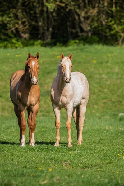 Strong and extremely correct young Quarter Horse colt in a very rare color. Spooky is Palomino and carries a roan gene. He also has green eyes (due to the Pearl gene). He is a very curious foal, people-oriented with a friendly character. He grows up with other mares and foals and is excellently socialized. He has already learned the basics of foal training, i.e. touching everywhere, haltering, lifting legs etc. It goes without saying that our foals are wormed regularly, have already been chipped and receive their AQHA pedigree certificate and DQHA equine passport. If desired, he can continue to be raised by us or move to a new home from around October. Spooky would be delighted to receive a visit. Please contact us.