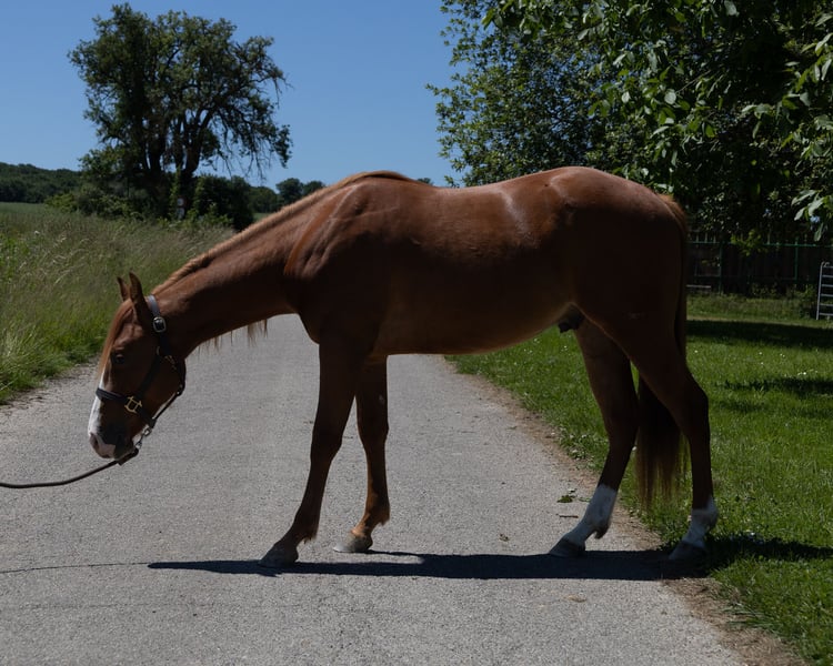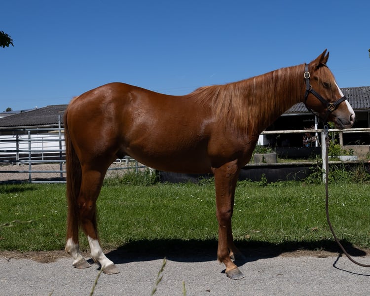 Zu verkaufen (im Auftrag) steht dieser hübsche, 2 Jahre alte QH Wallach „RN DIAMOND JOY“ mit dem Spitznamen „Diamond“. Er hat aktuell ein Stockmaß von 147cm und wird sicher noch in die Höhe gehen. Die langen Beine deuten jetzt schon drauf hin! Er hat sehr schöne Bewegungen, ist flink und zeigt sich schon jetzt im Trab und Galopp sehr ausbalanciert für sein Alter. Er läuft natürlich barhuf und darf bei uns gerade das Fohlen/Jungpferde- ABC lernen. Er kennt: - Angebunden stehen - Hufe geben - Duschen - Putzen - Sattel - Bodenarbeit - Spazieren - als Handpferd ins Gelände - Hufschmied Er ist super lieb im Umgang und hat extrem viel Will- To - Please. Er steht zur Besichtigung bereit und macht sicher mal ein sehr zuverlässigen Partner, egal ob für den Sport oder Freizeitbereich. Er hat AQHA Papiere, 7 Paneltest sowie einen Equidenpass. Videos von ihm in Bewegung können gerne zugeschickt werden.