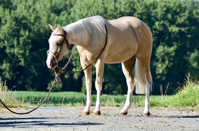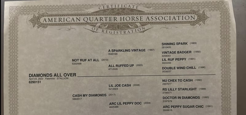 op Futurity Prospect looking for a Showhome Diamonds All Over 2023 QH gelding , palomino 5 panel n/n Nominated for: Germany, Italy, Euro 2yo Gelding by Not Ruf At All Jeremy is an absolute eye-catcher. 4 x high white legs and in the dream color Palomino. He will turn heads! Jeremy not only has a super pedigree, but also a very correct and compact body with his super lovely character. He already shows a lot of stop and is a great futurity prospect. His sire is Triple Crown Champion (NRHA Futurity Champion, NRHA Derby Champion, NRBC Champion) and Million Dollar Stallion Not Ruf At All. His dam is Cash My Diamonds, a direct daughter of the 3 million dollar stallion Lil Joe Cash. Sire: Not Ruf At All (A Sparkling Vintage x All Ruffed Up) ____ LTE $ 465.530,- PE: $ 1 Mio+