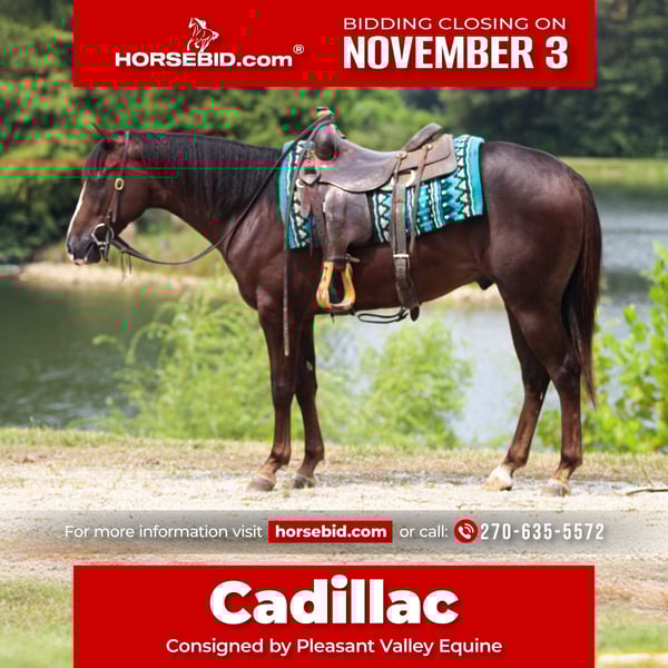 ⚜️𝐓𝐇𝐄 𝐅𝐀𝐋𝐋 𝐇𝐄𝐑𝐈𝐓𝐀𝐆𝐄 𝐂𝐋𝐀𝐒𝐒𝐈𝐂⚜️ Happening now thru MONDAY | NOVEMBER 3rd - Available EXCLUSIVELY on HorseBid's website! For more details and to register visit: www.Horsebid.com CONSIGNOR CONTACT: Pleasant Valley Equine 270-635-5572 LOCATION: Robards, KY BREED: Quarter Horse REGISTERED: Yes REGISTERED NAME: Frenchmanssunrisejac COLOR: Liver Chestnut HEIGHT: 14.1 AGE: 3 GENDER: Gelding Frenchmans sunrise jac aka Cadillac is an astonishing three year old gelding standing 14.1 hands. Cadillac has been in training with me for five months and has been willing, intelligent and a fast learner from day one. The only reason he wasn't started as a two year old was due to family health problems of his owners. He is coming straight from the breeders. Cadillac has an excellent foundation under him and is ready to go in any direction. With the pedigree he carries, options are endless. Cadillac has experienced many things in the past five months from riding fences, checking cattle, trail riding, going over the obstacle courses and much more. Cadillac will side pass, work gates, trot over ground poles, cross bridges, stand tied for hours patiently and quietly. He has lots of skills in the arena also. He has great lead departures, shoulder and hip control and is very soft in the bridle. If you're looking for a horse to last you a life time in the arena or on the ranch stop scrolling; you have found him. Cadillac stands great for the farrier, clips loads, bathes and is up to date on vaccines and worming. Cadillac sells 100% sound in everyway. Call today to set up an appointment to visit. Jacob 270-635-5572