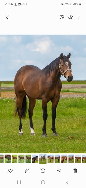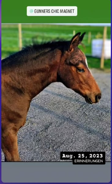 Quarter Horse Gelding Gunners Chic Magnet x Jacs Electric Spark Born 2023 Approximately 14.8 hh Bay Very handsome 5-panel N/N N/MYHM Location: 73571 Göggingen Friendly and well-behaved around people Knows lunging and riding, but not yet ridden Currently in an open stall / pasture with our foal group Lennox can stay with us for further upbringing or training if desired ☎️ 0177 4739109 Location: 73571