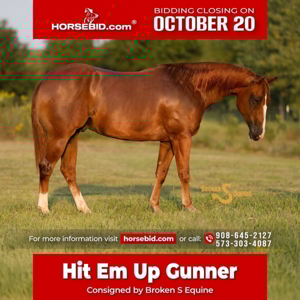 ♦️ 𝐭𝐡𝐞 𝐀𝐌𝐄𝐑𝐈𝐂𝐀𝐍 𝓕𝓪𝓵𝓵 𝓒𝓵𝓪𝓼𝓼𝓲𝓬 ♦️ Happening now thru MONDAY | OCTOBER 20th - Available EXCLUSIVELY on HorseBid's website! For more details and to register visit: www.Horsebid.com CONSIGNOR CONTACT: Broken S Equine Kieran 908-645-2127 or Beau 573-303-4087 LOCATION: Bogard, MO BREED: Quarter Horse REGISTERED: Yes REGISTERED NAME: Hit Em Up Gunner COLOR: Sorrel HEIGHT: 15 AGE: 3 GENDER: Gelding Bob is a 3 year old Quarter Horse gelding standing 15 hands high. He is by the famous, Gunner Dun It Again and out of a daughter of Wimpys Little Step. Bob is bred and trained for excellence, with the brain of an old soul schoolmaster. He has had 11 months of reining training, and has been continuing in a versatile training program here with us; ranch work, jumping, dressage, and going around with the kids. Absolutely anyone can safely ride and enjoy this gelding. He is user friendly and so tolerant to any rider or situation. Whether you want to excel in the show ring, or have a trustworthy and smart horse to enjoy at home - Bob is ready to be that parter for years to come. In the ring, Bob is ready to succeed in the reining pen, ranch riding, cow horse classes, or as a hunter/jumper. The best part about this horse is that you can really do it all with him. Under western tack, he circles well, has stylish spins, and a big stop. Anything you can do with a bridle on, you can do with it off. He has easy lead changes and smooth transitions. Under English tack, Bob rides like a hunter. He is putting together basic dressage tests and knows his lateral work. He is soft in the bridle and just overall a user friendly, forgiving horse to ride. He is an old soul through and through. On the trails and off property Bob acts like a seasoned pro everywhere he goes. Take him anywhere, do anything with him, and have a solid and reliable horse under you. You often forget his age, as he is always the quietest one of the group. He crosses any and all obstacles, is safe in traffic and on busy roads, and even does all the trail obstacle courses too! In the barn, Bob is Mr. Personality! He loves people and loves getting attention. He follows you around in the pasture, and is the first to the gate to greet you. He's happy living inside, or out, and is the easiest of keepers. ⚫️Bob is an easy keeper that requires no maintenance. We have a recent, clean vet check on file. ⚫️Our program aims to train and produce top quality horses and ponies for all disciplines and experience levels. Check out our website for testimonials! ⚫️We are located in Bogard, MO. We can help you arrange shipping anywhere! ⚫️For more information about Bob, or any of our other horses call or text us. Kieran 908-645-2127 Beau 573-303-4087