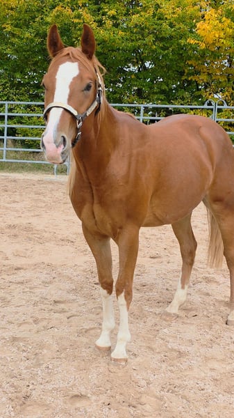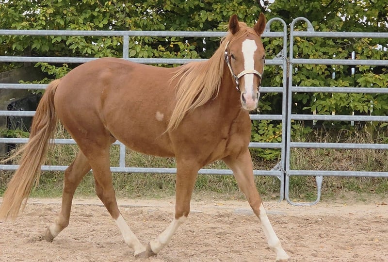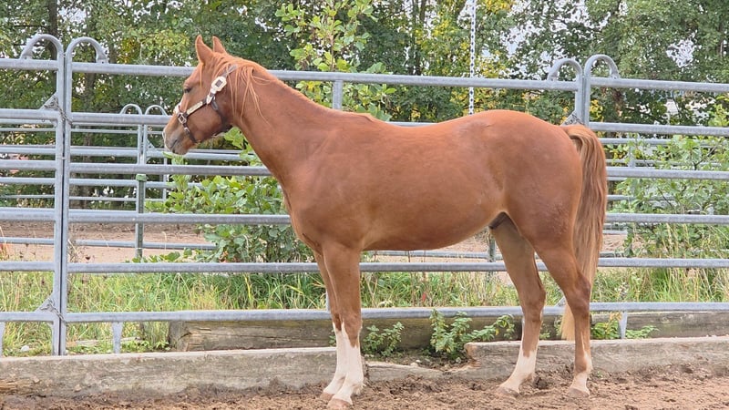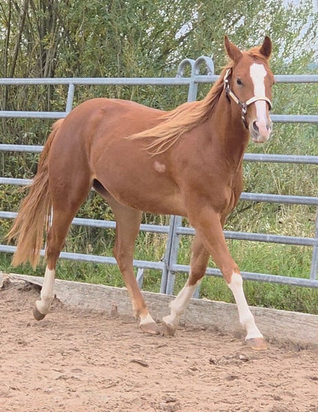 HES A RUF SHINER aka "Arkadi" Born on March 24, 2023, this small chestnut stallion is a promising young prospect. Like his half-brothers, he has a slightly flat mane and tail and carries the Rabicano gene in the form of a small heart on his right side — truly extraordinary. His sire, One Shiney Treat, is a direct son of Shining Spark (Sire: Shining Spark, $10.6 million in progeny earnings). His dam, Hagandaz, has LTE of $49,289 in NCHA and NRCHA, with OE of $65,616 in NRHA, NCHA, and NRCHA (Grays Starlight x Doc O Lena). His dam’s dam, Sailin Jumping Joana, is a daughter of Sailin Ruf — LiL RUF PEPPY, a $3 million sire, Hall of Fame member in AQHA & NCHA (2008), from a somewhat lesser-known maternal line tracing back to DOC LYNX (NCHA LTE: $4,716,808.10). ⭐️ 6-panel test: N/N His half-brothers from Smartest Little Cat were outstanding and received 1A ratings from the DQHA as foals, with scores between 80.41 and 85.34, which speaks volumes about the quality of his lineage and the offspring of this exceptional Shining Spark son. Arkadi has a confident, spirited personality. Curious, temperamental, and self-assured, he already demonstrates impressive movement potential — quick, balanced, with a strong, correct foundation, and very harmoniously muscled. Based on his current growth, we estimate he will be over 150 cm, likely around 153 cm. He is growing up in our colt group here at Hof Eichelbrunn. He shows a very confident demeanor but also respects the guidance of the older horses. During a recent evaluation, the offspring of One Shiney Treat impressed everyone, receiving top scores between 80.41 and 85.34, highlighting the excellent quality of this promising Shining Spark progeny. He can be transferred at any time with papers, COR, and a German DQHA equine passport. Like all our young horses, he is vaccinated against tetanus and regularly hoof-trimmed. He is enrolled in the DQHA Futurity. A very promising young horse for ambitious sport and leisure riders! Since March 24, 2025, Arkadi has been a happy gelding. And of course, he’s excited to pack his things and face new challenges. Visits are possible at any time by arrangement.