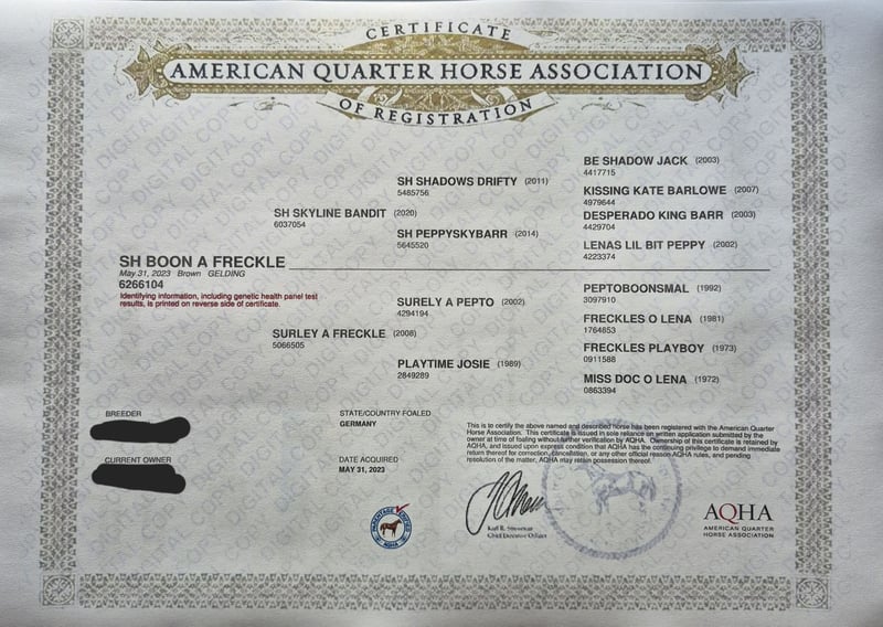 Pete is a calm and relaxed gelding. Great pedigree - suitable for sports and of course also for ambitious leisure riders. Clear mind. Affectionate. Grows up in a herd environment. Both parents are 5 Panel N/N. **Entering the yard and pastures of the establishment for viewings, as well as riding the sale horses, is always at your own risk! Exclusion of any warranty! We charge €50 for trial rides of our sale horses. This amount will be deducted from the purchase price of a horse.**