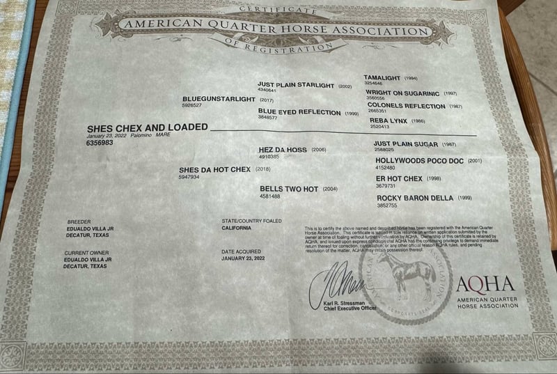 ONLINE AUCTION Place your bids at www.PlatinumEquineAuction.com Starting Bid $3500 Auction ends May 4th, 2025 Need a new saddle? Check out White Rock Saddles on our website or Facebook! Shes Chex and Loaded Rory, is a super sweet and beautiful 3 year old mare, she is ready for any job! She’s definitely a head turner! 14.1 hands tall, and has a sweet personality. Not marish at all, she can live in a barn stall or out in pasture and gets along with everybody! Rory can ride out alone or in groups on trail, there’s no funny business about her. She loves water, will climb hills and go over logs! She will walk out or go nice and easy, whatever speed you ask her to go. She saddles quietly, bathes great, loads in the trailer, and great for the farrier as well. She was even in a 4th of July parade as a 2 year old! Rory has been so many places she is such a fun one to ride! I have tracked some calves on her, she has some cow to her and loves to track! Take her to the roping pen or show pen she is suited for just about anything. Rory has been hauled extensively on long and short hauls and has seen the sights! Not much bothers this mare, she’s been to rodeos with firework shows and hauled across the country! She will be a jam up mare whatever the job may be! She would excel in roping events, ranch riding, reining, and trail! Her parents and grandparents excelled in the reining show pen and the roping pen! She has money earners all across her papers, no doubt she can be one too! She circles really pretty at the walk, trot, or lope, picks up both leads and is picking up a really nice lead departure! Rory turns around nicely, and has a good stop to boot. Up to date on shots, teeth, deworming, and being shod. She loves attention, to be groomed and loved on. Don’t miss out on this beautiful, high quality type of mare! Located in Stephenville, TX. Shipping available anywhere! Including Hawaii, Canada, Mexico or anywhere in between. Contact Michelle Ouellette 254-595-1239 Located in Stephenville, TX. ONLINE AUCTION Place your bids at www.PlatinumEquineAuction.com Starting Bid $3500 Auction ends May 4th, 2025 Need a new saddle? Check out White Rock Saddles on our website or Facebook!