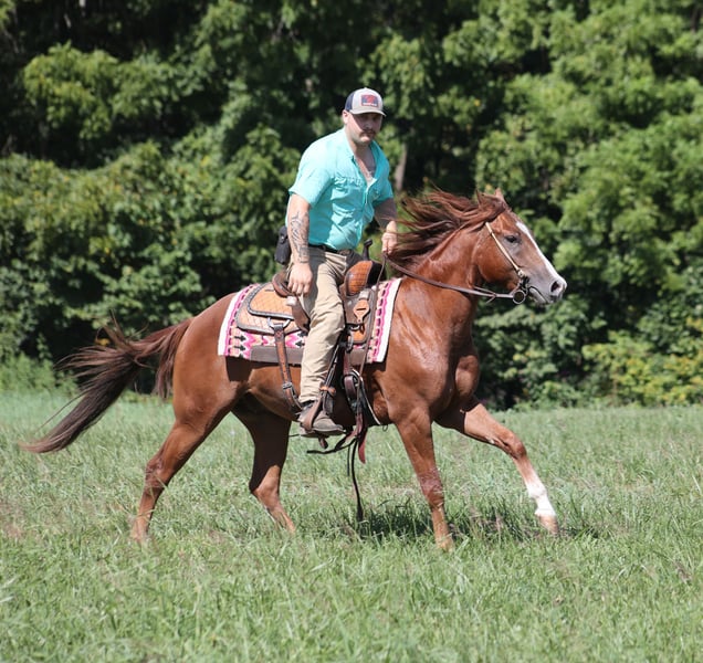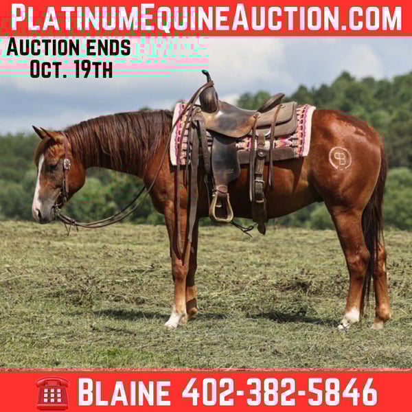 ONLINE AUCTION Place your bids at www.PlatinumEquineAuction.com Starting Bid $3500 Auction ends October 19th, 2025 Need a new saddle? Check out White Rock Saddles on our website or Facebook Boons Playful Gun is a stout built 14.2H, Chestnut, Registered Quarter Horse Gelding that is a 2022 model. He is a well bred horse being a grandson of the legendary Playgun with Peptoboonsmal on the bottom side of his pedigree! Boon has been well exposed and traveled to several states including Alabama, Oklahoma, Missouri, Tennessee and Kentucky! He has been best mind of any young horse that you will find! He is super quiet and gentle. Very easy to handle, loves attention, he is ALWAYS the same horse whether ridden daily or turned out in the pasture for a month. Boon has done it all on the ranch from herding to sorting, pasture roping… he has been tracking the hot heels around as well and does good at that. Boon has been trail ridden in rough rocky terrain and handles it with ease. He will cross creeks, ditches, logs and navigate rough rocky areas. He has a smooth jog and a very smooth lope! He takes the correct leads, lopes nice circles, is one hand broke and reins around with ease. He has been exposed to all kinds of wildlife. He has been ridden many miles in the mountains of Eastern Kentucky and encountered every obstacle possible on the trail. He will go up or down even the steepest slopes, across deep creeks, over downed trees, and over all types of rough terrain while still being sure footed. Boon is a horse that the whole family will ride and enjoy as he is super quiet and gentle. Whether you want to rope or work on the ranch, trail ride or simply let the family enjoy a walk around the barn lot... Boon is a horse that will handle any of those task! Located in Hugo, OK but pickup also available at out place in Kentucky. Contact Blaine with B&B Quarter Horses 402-382-5846 ONLINE AUCTION Place your bids at www.PlatinumEquineAuction.com Starting Bid $3500 Auction ends October 19th, 2025 Need a new saddle? Check out White Rock Saddles on our website or Facebook