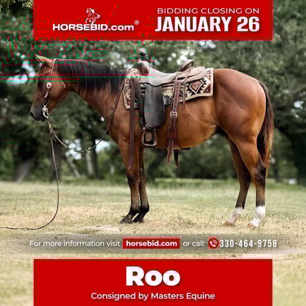 𝐉𝐀𝐍𝐔𝐀𝐑𝐘 ⭐️𝑨𝒍𝒍 𝑺𝒕𝒂𝒓 𝑳𝒊𝒏𝒆𝒖𝒑⭐️ Happening now thru MONDAY | JANUARY 26th - Available EXCLUSIVELY on HorseBid's website! For more details and to register visit: www.Horsebid.com CONSIGNOR CONTACT: Masters Equine 330-464-9758 LOCATION: Orrville, OH BREED: Quarter Horse REGISTERED: No REGISTERED NAME: Roo COLOR: Bay HEIGHT: 14.2 AGE: 4 GENDER: Gelding Roo is a family-oriented gelding that can ride with some class for the adults and is gentle enough for young kids to ride around. Roo is the type of horse that enjoys the kids dolling him up. He has a walk, trot, and lope that are smooth as silk. He is great out on the trail, carefully placing his feet to take care of his rider in any situation. He has a wonderful personality—if you are looking for a horse to bond with and spend time with outside of riding, Roo is your guy. Roo has a one-handed neck rein and will move willingly off your leg cues. He has been hauled around the country and ridden in the arena, giving him a versatile handle. He gets along great with the other horses in the pasture and has no vices when pulling him out of the stall on Monday morning. In the video, Roo was pulled straight out of the stall after being on western alfalfa for several days, loaded up, hauled to a completely different location, unloaded, and ridden immediately. He walked off the trailer like he had been there his whole life. We were riding in very windy conditions, yet Roo stayed relaxed on a loose rein and never batted an eye at traffic or new obstacles, showing his steady, dependable mindset. Roo has been roping the skid on both the head and heel side, as well as loping the barrel pattern and being taken through the poles. He has a solid foundation that allows him to go in any direction. This is a super versatile gelding with a great disposition. Roo stands quietly for the farrier and will ground tie until you tell him differently. He is the perfect size for a rider with bad knees, as he is easy to get on and off on the trail. He has been exposed to all farm machinery, equipment, road traffic, gunfire, deer, cattle—you name it. He is sound and up to date on teeth, vaccines, coggins, and health papers. This gelding has been nothing short of a pleasure to work with since he stepped foot on our property. No matter what direction you want to go, this phenomenal gelding will be sure to take you there. He has all the buttons—side pass, turnaround, leg yield—but is just as easily point-and-go. Gentle, flashy, and broke, with unlimited potential!
