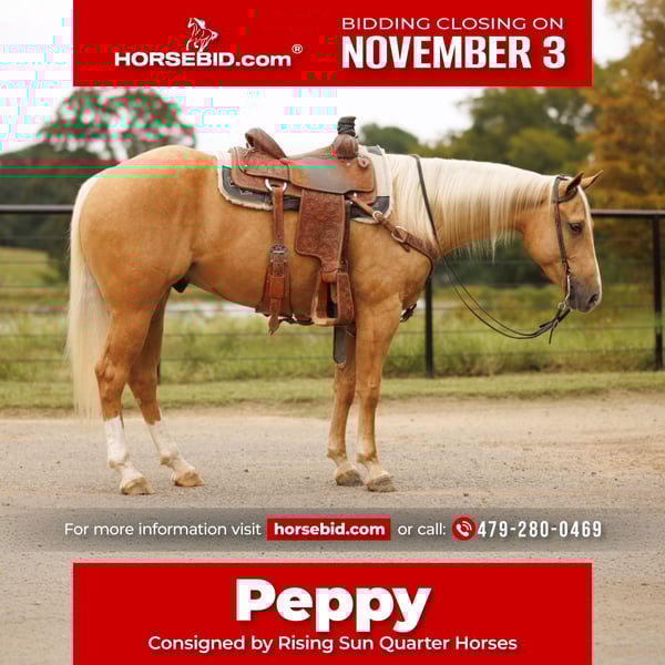 ⚜️𝐓𝐇𝐄 𝐅𝐀𝐋𝐋 𝐇𝐄𝐑𝐈𝐓𝐀𝐆𝐄 𝐂𝐋𝐀𝐒𝐒𝐈𝐂⚜️ Happening now thru MONDAY | NOVEMBER 3rd - Available EXCLUSIVELY on HorseBid's website! For more details and to register visit: www.Horsebid.com CONSIGNOR CONTACT: Rising Sun Quarter Horses 479-280-0469 LOCATION: Morrilton, AR BREED: Quarter Horse REGISTERED: Yes REGISTERED NAME: RR Peppys Paulie COLOR: Palomino HEIGHT: 14.3 AGE: 4 GENDER: Gelding RR Peppys Paulie, affectionately known as Peppy, is a 2021 AQHA-registered palomino gelding standing a correct and balanced 14.3 hands. He’s as handsome as they come — golden coated with a white mane and tail, clean-made through the neck and shoulder, and carrying that kind, intelligent expression that speaks volumes about his disposition. Peppy is the rare combination of beautiful, broke, and exceptionally well-mannered — the kind of young gelding you can be proud to own and confident to ride. By RT Diamond King and out of Peppys Okie Paul, his pedigree ties him to the great Peppy San Badger, Okie Paul Quixote, and Old Tom Cat 3 — names known for producing horses with ability, grit, and heart. Those genetics come through in every step Peppy takes. He’s naturally athletic, soft-minded, and carries an effortless handle that reflects both talent and correct training. Peppy has been a part of our program for a few years now, and in that time, he’s become a true family favorite and a go-to horse in our operation. He has been used on the ranch, giving him a foundation rooted in real-world experience. He’s gathered cattle, sorted pairs, doctored outside, and checked fences across every kind of country. Confident through brush, creeks, and rough ground, Peppy knows how to cover country with purpose and poise. Beyond his work experience, Peppy’s perfect handle shows in every move he makes. He lopes off soft and collected, transitions with precision, and stays balanced and correct in every gait. His big, deep sliding stop and stylish spins turn heads wherever he goes — smooth, controlled, and effortless, the mark of a horse who’s been thoughtfully developed and ridden right. He rides one-handed, works off seat and leg, and stays light in the bridle without ever getting reactive. His handle is polished, responsive, and honest — a pleasure for even the most particular rider and yet forgiving for the less experienced rider. On the ground, Peppy is a complete gentleman. He’s easy to catch, stands tied quietly, saddles and shoes without issue, and hauls like a pro. His respectful nature and steady temperament make him enjoyable to be around day in and day out. With his looks, handle, and real-world background, RR Peppys Paulie is the total package — a young gelding with a proven work ethic, a ton of class, and a level of training that’s hard to find. Whether you’re looking for a refined ranch mount, a show-pen prospect, or an all-around partner with style and substance, Peppy checks every box.