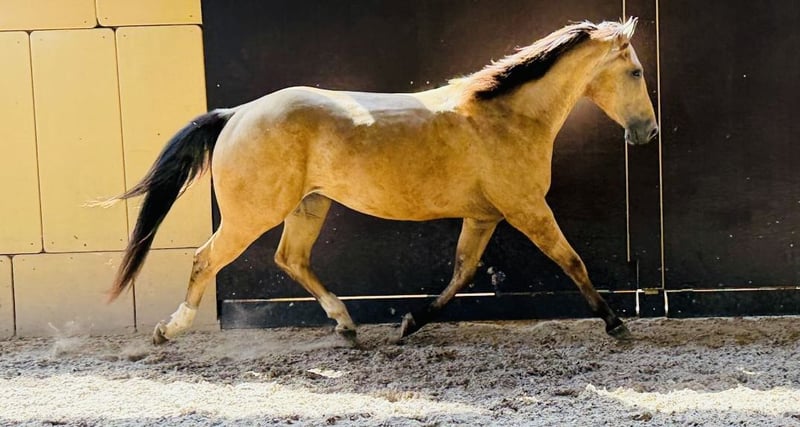 Quarter Horse Wallach, Buckskin aus 2022 sucht neuen Besitzer. Ich biete hier meinen direkten Fritz Power Sohn zum Verkauf an. Fritz ist seit Fohlen in meinem Besitz und wuchs bis 3 jährig in einer gemischten Jungpferde Gruppe in Offenstallhaltung auf. Aktuell steht er in einer Box mit täglich Auslauf. Er ist super Mega gut erzogen und sehr brav. Er kennt Kinder, Hunde, Traktoren und andere Tiere. Ist super verträglich mit allen Rassen, Geschlechtern und Größen seiner Artgenossen. Fritz ist groß (1,52+) und da wird noch bissl was an Größe und Fundament kommen. Charakterlich ist er absolut ehrlich und dem Menschen zugewannt. Er beißt, schlägt, tritt nicht und ist immer freundlich zu jedem. Hufschmied und Tierarzt kein Problem und Hänger ist er auch schon gefahren. Wir haben angefangen, schon einiges vom Boden aus zu erlernen. Er kennt Bodenarbeit, spazieren gehen (auch alleine) und die Arbeit an der Longe, dass Aufsteigen und Reitergewicht sowie die ersten Schritte. Er ist aber noch NICHT geritten und kann auch NICHT Probe geritten werden. Dadurch ,dass ich ihn kenne seitdem er 6 Wochen alt ist und ihn auch beim Züchter regelmäßig besuchen konnte, sind mir keinerlei gesundheitlichen Veränderungen und Einschränkungen bekannt. Eine AKU bekam er als Fohlen, die ohne Mängel war, seitdem ist keine AKU oder ähnliches gemacht worden und wäre selbstverständlich bei Kosten Übernahme möglich, wenn der neue Besitzer dies wünscht. Er wird nur aus absoluten Zeitmangel wegen Jobwechsel und in nachweislich gute Hände abgeben. Preis VB