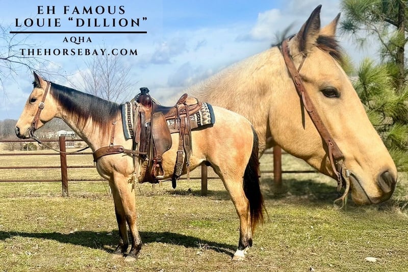 EH Famous Louie aka Dillion is a four-year-old buckskin gelding standing 15.1 hands. Don’t let his age fool you — he’s gentle, easy going, and good minded. He’s easy to handle, not nervous, and has been trail rode and used around the sale barn. He’ll pin his ears and watch a calf and is always willing to do his job. Dillion has the color, brains, and disposition everyone looks for. He’s not spooky or jumpy, just a good honest young gelding you can saddle up and enjoy. Front or back on the trail, he stays the same and is happy just walking along.