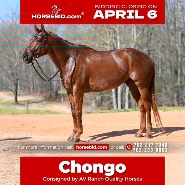 🌟𝑨𝒑𝒓𝒊𝒍 𝐀𝐋𝐋 𝐒𝐓𝐀𝐑 𝐋𝐈𝐍𝐄𝐔𝐏🌟 Happening now thru MONDAY | APRIL 6th - Available EXCLUSIVELY on HorseBid's website! For more details and to register visit: www.Horsebid.com CONSIGNOR CONTACT: AV Ranch Quality Horses 762-217-7940 762-283-0063 LOCATION: Hull, GA BREED: AQHA REGISTERED: Yes REGISTERED NAME: Nite Time Chongo COLOR: Red Roan HEIGHT: 15.1 AGE: 4 GENDER: Gelding Meet Nite Time Chongo! He is a 4 year old, 15.1 HH AQHA red roan gelding. Chongo is the kind of horse that you don’t come across often; he is gentle, kind hearted and a true gentleman both on the ground and in the saddle! Grandson of One Time Pepto with Peptoboonsmal and Docs Hickory on his papers. Pedigree that speaks for himself. Chongo is a well trained partner who loves and excels in the cross country field, once you show him something he just gets it. He is currently doing full courses at 2’6” and jumping 3' logs, with a straight forward and willing attitude to please his rider. Chongo responds to both leg cues and voice commands. Brave to the jumps, natural lead changes in the field, not looky and will pack you around the course. He collects beautifully into the bridle, takes both leads, pivots and side passes and has seat belt worthy brakes! Not only is he fantastic English, but you can ride him Western on a loose rein all day long! Chongo has a nice neck rein and is a point-and-go type of guy even if ridden bareback. On the trails he can go out alone or with a group, he has been ridden up and down both gravel and paved roads and is fine with dogs, SxS, farm equipment, and other animals. If you want to take him through a creek, up the hills, over logs or through the woods, Chongo will take all trails head on with confidence. He also has experience with various obstacles such as bridges, tarps, noodles, and gates. Chongo has had some early cutting horse foundation adding to his versatility and responsiveness. We have used him to collect and push cattle to new fields. Chongo has a in your pocket personality, with no known vices or bad habits. He is great to be bathed, brushed, clipped, tacked up, loads on a trailer and stands well for the farrier. Chongo has a recent vet inspection, coggins, and vaccines. He is both sound and safe. Regardless of whether you want to jump a course, push your cows or go on a trail Chongo will be your guy every single time!