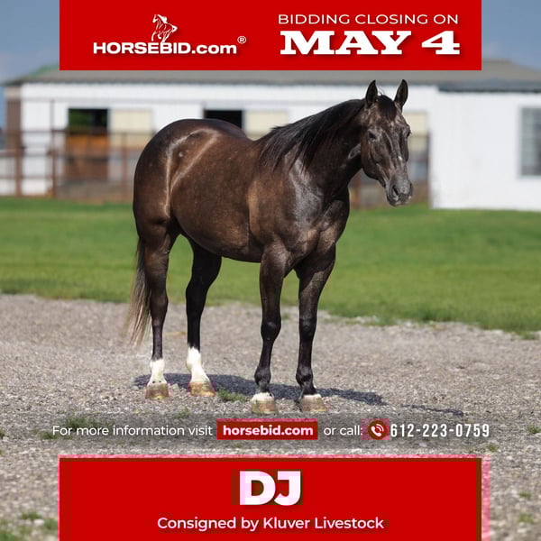 ▪️▫️◾️𝐭𝐡𝐞 𝑴𝒂𝒚 𝐒𝐞𝐥𝐞𝐜𝐭◾️▫️▪️ Happening now thru MONDAY | MAY 4th - Available EXCLUSIVELY on HorseBid's website! For more details and to register visit: www.Horsebid.com CONSIGNOR CONTACT: Kluver Livestock 612-223-0759 LOCATION: Ripley, OK BREED: AQHA REGISTERED: Yes REGISTERED NAME: DD PLAY BARS COLOR: Grey HEIGHT: 14.3 AGE: 4 GENDER: Gelding Take a look at him! DJ is a 4 yr old grey gelding standing at 14.3 hands weighing 1200 lbs. DJ is a sight to see that is for sure! He has a gorgeous grey coat with dapples, and confirmation you could look at all day. He has a solid thick neck, solid clean legs, big hip, and a great top line! Not only does he have looks but he has a great personality! He is very friendly and curious to people and horses and gets along with everyone! He is always looking for attention as soon as you walk in the barn! DJ is just as great under saddle he was started correct and rides around correct! He has a great stop, great backup, and turnaround. He is very soft in the face and can get rode in any bit. He is the definition of a ranch horse he was used on a big ranch in New Mexico for many months so he knows what a long work day is! He has doctored wheat cattle, gathered cattle, roped off of, check fences, and anything that needs to get done that day! He has also been rode by my younger brothers for miles and miles of trails. He’s crossed over rivers, logs, ditches, brush, muck, and badlands territory without a bat in the eye. He is as good of a ranch horse as he is a trail horse! He has also spent time with a reining trainer so he truly a dream to ride in or out of the arena. This horse is truly a package deal. If your looking for one to use on those long days or one for the whole family to enjoy DJ is your horse. He is the type of horse you don’t have to worry about, through him out for the winter and use him again in the spring! He is an extremely easy keeper so you’ll never stress about him!