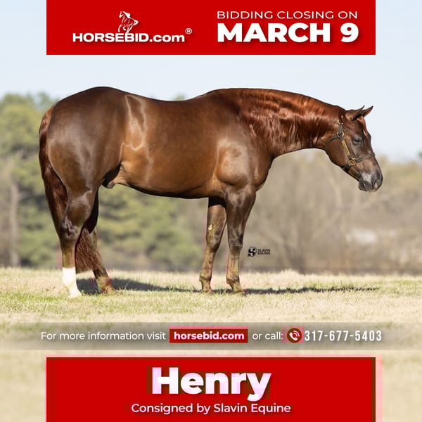 ℳ𝒶𝓇𝒸𝒽 ♦️𝐑𝐈𝐃𝐄𝐑'𝐒 𝐂𝐇𝐎𝐈𝐂𝐄♦️ Happening now thru MONDAY | MARCH 9th - Available EXCLUSIVELY on HorseBid's website! For more details and to register visit: www.Horsebid.com CONSIGNOR CONTACT: Slavin Equine 317-677-5403 LOCATION: Whitesboro, TX BREED: AQHA REGISTERED: Yes REGISTERED NAME: Cats In Tinseltown COLOR: Chestnut HEIGHT: 14.3 AGE: 5 GENDER: Gelding There aren’t many horses like Henry — talented, kind, and just plain fun to be around. Henry is a 5-year-old gelding by the legendary 4 million dollar sire, Hollywoodstinseltown. He’s a rich, dark brown with a striking copper-red mane and tail, a cute little face, and ears full of expression that show off his personality. He will meet you at the gate and loves to be around people! Henry is the kind of horse people notice and remember — sweet, friendly, and approachable. He’s a finished reiner with all the right buttons — big, confident stops when you say “whoa,” easy turnarounds, smooth departures, and a slow, cadenced lope that feels comfortable and correct. He’s soft, honest, and uncomplicated. He can show off when you ask him to, but he’s just as happy to keep it easy and quiet. While reining is his foundation, Henry could also step right into ranch riding. His extended trot is fancy and ground-covering, his jog is smooth and cute, and his lope departures are easy. He carries himself with presence in the arena and has that kind of look judges notice. Henry would make a great non-pro horse, a solid youth partner, or just a really nice horse to enjoy at home or on the trails. He’s push-button, quiet, and forgiving — a horse you can trust every ride. You can step him up for a show, or hop on him bareback in a halter and just play around — he’s that versatile. He has the mind and talent to go in whatever direction you would like! Outside the arena, Henry is confident and relaxed. He’ll ride out alone with no hesitation, goes over bridges, and gets along great with other horses. In the barn, he’s a total gentleman. Henry is an easy keeper, stands tied patiently, lunges with slack in the line, loads easily, stands still for you to get on, and loves a bath in the wash rack. Henry loves treats and attention, and he’ll happily let you shower him with affection — but he’s always respectful of your space too. Henry handles time off well and comes back quiet and ready to go. He is up to date on everything, ready with a Coggins, and we are happy to help arrange shipping nationwide or even internationally! Henry has a set of clean X-rays linked below, and we have also provided a vet letter stating he is in good standing in the gallery above. A talented, broke reiner with the versatility to step into ranch riding — Henry is kind, dependable, and a pleasure to have around. We invite everyone to come out to our ranch in Whitesboro, Texas, to meet and try Henry — we know you’ll love him as much as we have!