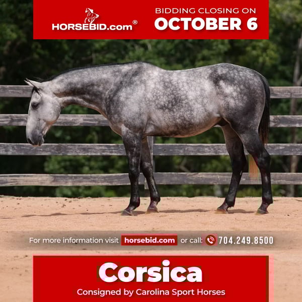🍂 𝓐𝓾𝓽𝓾𝓶𝓷 𝑨𝑳𝑳 𝑺𝑻𝑨𝑹 𝑳𝑰𝑵𝑬𝑼𝑷 🍂 Happening now thru MONDAY | OCTOBER 6th - Available EXCLUSIVELY on HorseBid's website! For more details and to register visit: www.Horsebid.com CONSIGNOR CONTACT: Carolina Sport Horses 704.249.8500 LOCATION: Clover SC BREED: Quarter Horse REGISTERED: No REGISTERED NAME: Corsica COLOR: Dapple Gray HEIGHT: 14.3 AGE: 5 GENDER: Gelding Corsica is a 5 year old Quarter Horse gelding standing 14.3 hands high. This guy is the perfect family horse. He was born and raised on one farm and coming to our place was his first time leaving home. Most horses need time to settle but not Corsica. Pull him out of the pasture every day, or once a month, and have the same horse every time. He packs the kids around in the ring, on the trails, and on hunter paces. He goes anywhere you point him, bravely and honestly. His size is ideal for a family, as the little ones won't feel over faced, yet still being big enough for the adults to enjoy. His personality is the best! He loves to give back scratches and kisses, and will stand around for hours to be loved on. Corsica loves his people, and will gladly do any job with any rider, from the cross country course, trail rides, dressage, and more! In the ring, Corsica is straightforward and tolerant. He is doing first level dressage tests and will pop over small jumps. The kids are always choosing him for their riding lessons (Gracie's FAVORITE), and taking him out on hacks afterwards. He will ride in a frame, or on a loose rein, he's soft in the bridle and very easy to ride. His canter is the smoothest you'll find! He picks up both leads, has great walk to canter transitions, and is easily adjustable. Kids, and adults, of all ages and experience levels have ridden him. On the trails and off property, Corisca is a very good boy. He's gone on lots of hunter paces with the kids and always gets his rider to the other side, even if they don't do the best job of setting him up. He trail rides alone or in a group, and is happy leading or following the pack. He is as point and shoot as one can get. He will bravely cross any obstacle, river, bank, etc that you ask him to. He is a reliable and steadfast partner, in and out of the arena. Corisca crosses water, logs, is safe in traffic, and is quiet with other animals and livestock. Load him up and take him anywhere and know he will be the same horse on or off property. He is a gentleman to trailer and a breeze to go places with. He is so much fun on the cross country course! He jumps around all of the questions with ease, and is simple enough for a kid, pony clubber, or novice rider to jump around the course with. In the barn, Corsica is a favorite! If you see his video clips, you can see that the kids are always all over him. He absolutely adores people, and is the biggest love bug always gently nuzzling you and giving you scratches with his nose. Though he is in your pocket, he is still very polite and well mannered. Corsica is never pushy or rude - he is quite the gentleman! Corsica is a good boy when stalled, and currently lives out 24/7 weather permitting in a mixed herd. He gets along well with others and is the easiest of keepers. Corisca requires no maintenance, has no quirks, and is an overall solid citizen that everyone loves and enjoys!