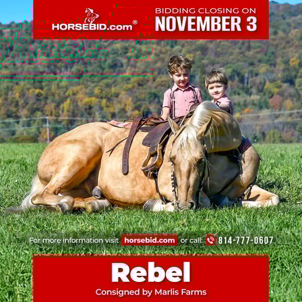 ⚜️𝐓𝐇𝐄 𝐅𝐀𝐋𝐋 𝐇𝐄𝐑𝐈𝐓𝐀𝐆𝐄 𝐂𝐋𝐀𝐒𝐒𝐈𝐂⚜️ Happening now thru MONDAY | NOVEMBER 3rd - Available EXCLUSIVELY on HorseBid's website! For more details and to register visit: www.Horsebid.com CONSIGNOR CONTACT: Marlis Farms 814-777-0607 LOCATION: Rebersburg, PA BREED: AQHA REGISTERED: Yes REGISTERED NAME: PLAYGUNS REVOLUTION COLOR: Palomino HEIGHT: 15 AGE: 4 GENDER: Gelding “PLAYGUNS REVOLUTION” aka “Rebel” is a 2021 model (4 year old) AQHA gelding standing at 15 hands tall. This is an exceptionally well bred gelding and own grandson of “Einsteins Revolution” a 2.4 million dollar sire with lifetime earnings over 350k! “Rebel” is a barn favorite here, he is beautiful, classy, well broke and gentle! Rebel rides English, western and bareback. He has very smooth, comfortable gaits with easy transitions. Rebel is very soft in the face, will frame up nicely, he neck reins, side passes and will even lay down on command! He will ride indoors or out and loves to trail ride! Rebel has ridden downtown and is traffic safe! He is use to loud heavy equipment around the farm. On the trail he will step over logs, cross water, bridges, railroad tracks etc! He is a very level headed gelding that always aims to please! Rebel is an easy keeper at home with no complaints! He is happy in a stall or can be turned out in a mixed herd. He is well mannered for all the normal barn tasks, vet, farrier, dentist etc! He stands to be groomed, bathed, clipped, tacked up and mounted! Rebel loads and hauls like a dream and is always the same, well mannered gentleman whenever we go! If you think Rebel is the one for you, please feel free to reach out or schedule a visit to come meet us! Call Mark @ 814-777-0607