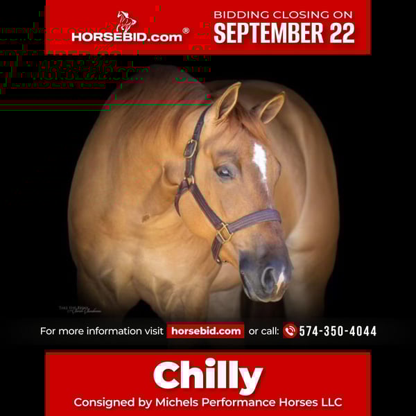 🍁𝒕𝒉𝒆 𝐅𝐀𝐋𝐋 𝑺𝒑𝒆𝒄𝒕𝒂𝒄𝒖𝒍𝒂𝒓🍁 Happening now thru MONDAY | SEPTEMBER 22nd - Available EXCLUSIVELY on HorseBid's website! For more details and to register visit: www.Horsebid.com CONSIGNOR CONTACT: Michels Performance Horses LLC 574-350-4044 LOCATION: Cottage Grove, MN BREED: AQHA REGISTERED: Yes REGISTERED NAME: SS I Got Chillz COLOR: Red Dun HEIGHT: 15 AGE: 4 GENDER: Gelding Chilly is one cool dude! (Get it? Its not just a "Dad Joke" -- its accurate!) This big, athletic gelding is a real go-getter with a "can-do" attitude. Standing at about 15 hands, he's got a great build and a gorgeous red run coat that'll turn heads. Chilly is a finished reiner, but he's up for trying anything - and he's got the personality to match! He's a breeze to ride, soft in the bridle, and super easy to steer. Plus, he's got a smooth jog and a killer extended trot that'll make you look good in the arena. This guy is bred well, too - he's sired by SG Frozen Enterprize and out of an NRHA Money earning mare. Talk about good genes! Chilly's got the moves to prove it, too. He'll plus all those reining maneuvers and has a big stop that'll make you feel like a pro. And the best part? He's sound, sane, and ready to rock in the reining, ranch horse classes, or wherever else you want to take him. Oh, and did I mention he's an easy keeper who loads and clips like a champ? This guy's the total package! He never causes any drama and is great outside and in his stall. He could not care less about traffic, dogs, kids running around, etc. If you're looking for a fun, versatile horse who's got the looks and the talent to match, Chilly is your guy. Check him out at MichelsPerformanceHorsesLLC.com and see for yourself why he's a standout in the arena. With his winning attitude and impressive skills, Chilly is sure to make a great partner for whatever adventures you have in store. Don't miss out on the chance to ride off into the sunset with this amazing gelding - contact Michel's Performance Horses LLC today and get ready to hit the trails in style!