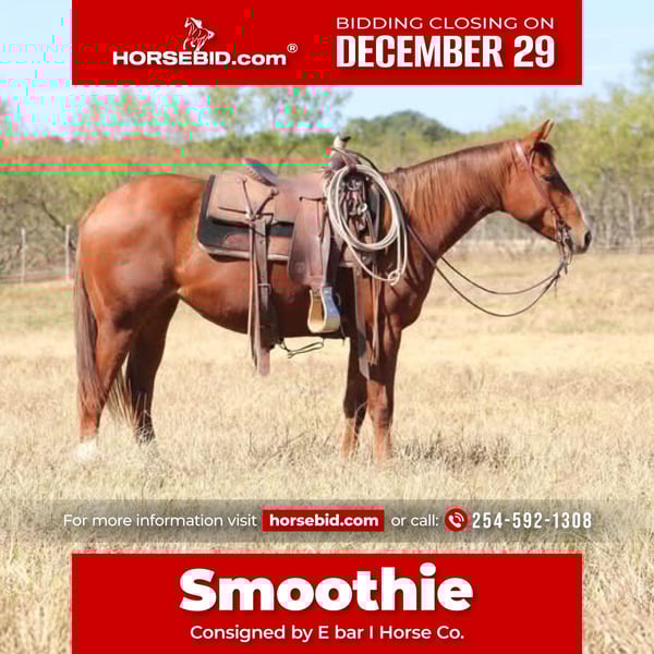 ⚜️𝐓𝐇𝐄 𝓗𝓮𝓻𝓲𝓽𝓪𝓰𝓮 𝐖𝐢𝐧𝐭𝐞𝐫 𝓒𝓵𝓪𝓼𝓼𝓲𝓬⚜️ Happening now thru MONDAY | DECEMBER 29th - Available EXCLUSIVELY on HorseBid's website! For more details and to register visit: www.Horsebid.com CONSIGNOR CONTACT: E bar I Horse Co. 254-592-1308 LOCATION: Salado, TX BREED: AQHA REGISTERED: Yes REGISTERED NAME: JUST A SMOOTH CATT COLOR: Sorrel HEIGHT: 15 AGE: 5 GENDER: Mare If you’re looking for a mare that been out on the ranch and seen the sights look no further. Smoothie has done all aspects of ranch work and is looking for her new home! She’s a been there mare with an easy going personality that is easy to fall in love with. Out doctoring yearlins, catching cows, and sorting mostly Smoothie would be a perfect contender to take into the arena and finish in the roping pen or even just out on the trail with friends to enjoy a relaxing ride. Take her and turn her into a performance horse or leave her just as she is and enjoy her reliability and easy to be with attitude.