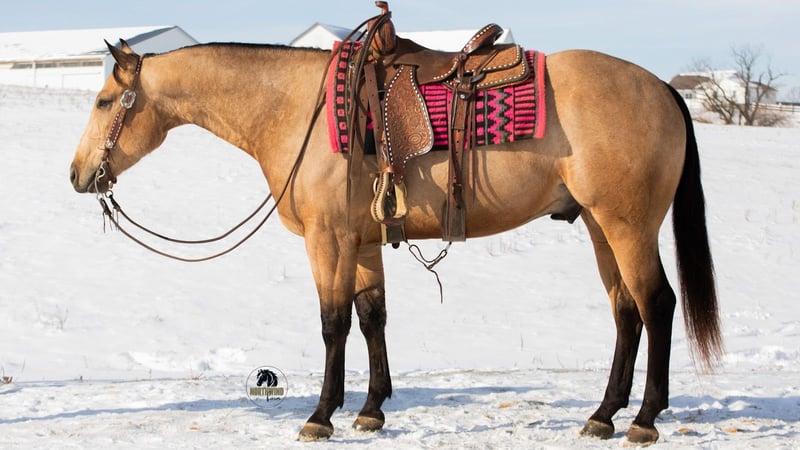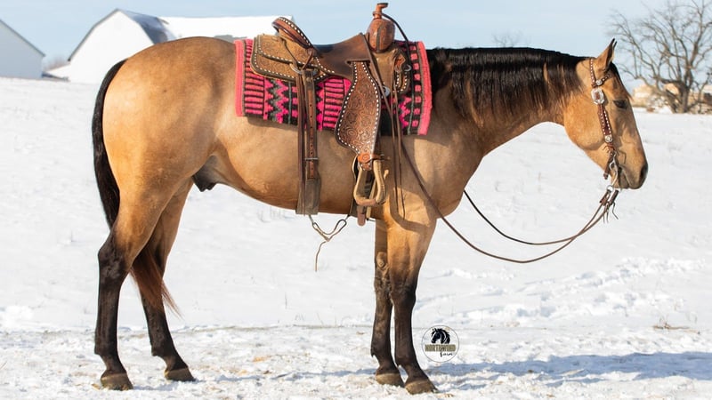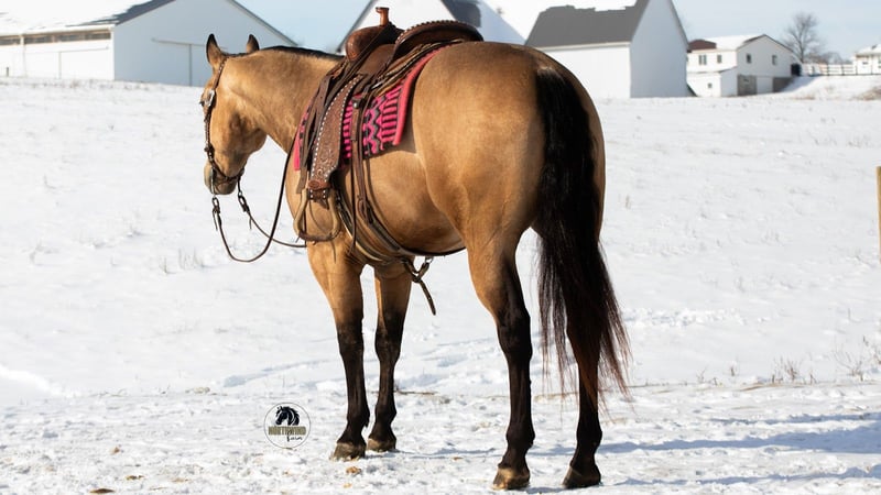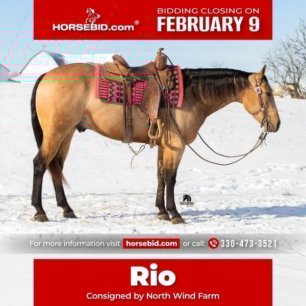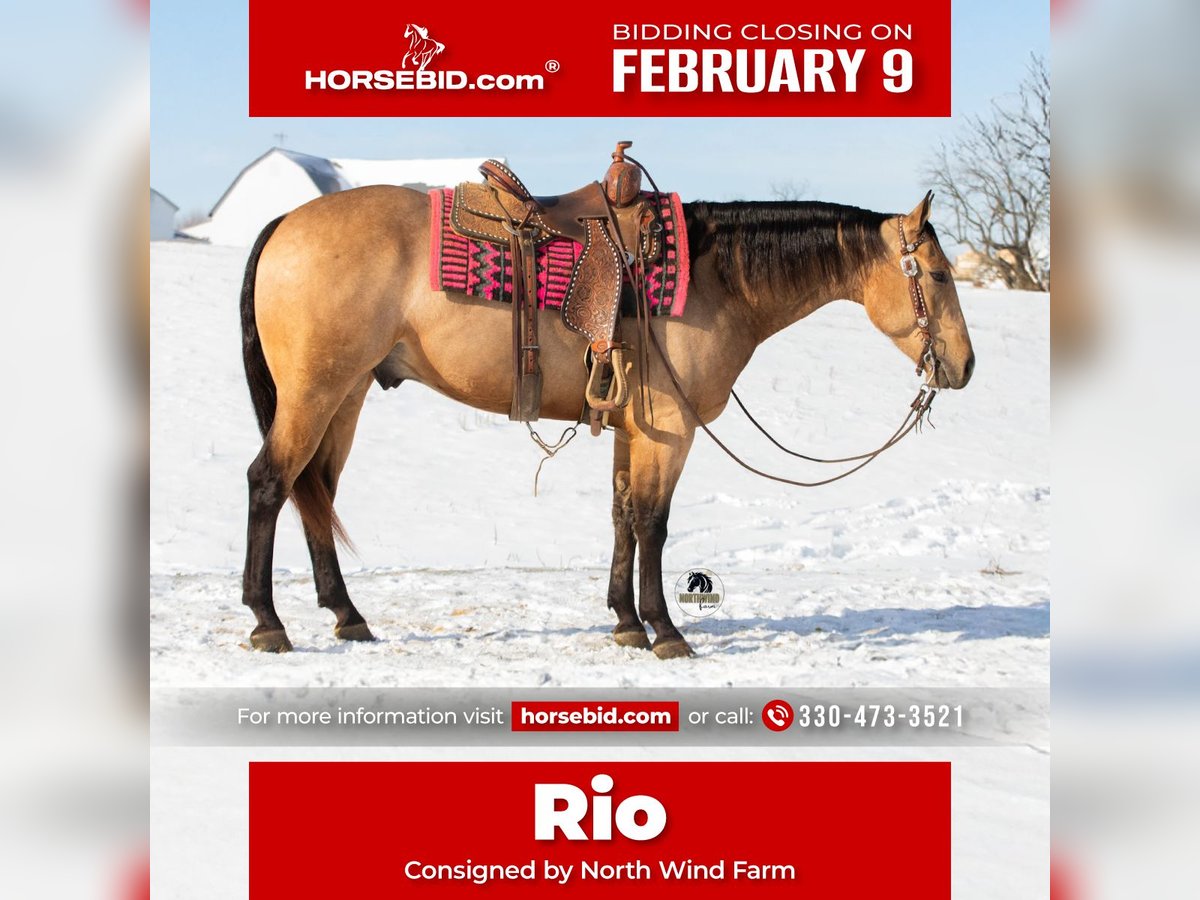 ❤️🔥𝑩𝒆 𝑴𝒊𝒏𝒆 𝐒𝐄𝐋𝐄𝐂𝐓❤️🔥 Happening now thru MONDAY | FEBRUARY 9th - Available EXCLUSIVELY on HorseBid's website! For more details and to register visit: www.Horsebid.com CONSIGNOR CONTACT: North Wind Farm 330-473-3521 LOCATION: Fredericksburg, OH BREED: AQHA REGISTERED: Yes REGISTERED NAME: Reds Shady Bill COLOR: Buckskin HEIGHT: 15.1 AGE: 5 GENDER: Gelding Introducing REDS SHADY BILL “ RIO” is a 5 yr old registered AQHA buckskin gelding standing at 15.1hh! Rio is very well trained and very well mannered! He has a gentle personality and is very easy going! He stands nicely for grooming, tacking up, and for getting bathes! He likes being turned out in the pasture and is easy to catch! He picks up his feet good and stands well for the farrier!Rio is an easy keeper and requires no special maintenance! He rides great in the arena as well as on the trails! He has an easy to ride walk, trot, canter! He moves off of leg pressure, neck reins, and stops easily! He will pivot and side pass, He rides Western as well as bareback! He can also be rode bridles! He rides great out on the trails! He will cross creeks, steps over logs, and is surefooted going up and down hills! He is used to being around dogs and atvs! We have rode him out on the state route and he is traffic safe! He is not easily spooked and the same horse every time you ride him! He will cross all the obstacles as well! He is a seasoned trail horse and has amazing talent in the arena! He is the perfect ranch trail prospect! He could go in any direction! He is safe for your family but fun enough for everyone!