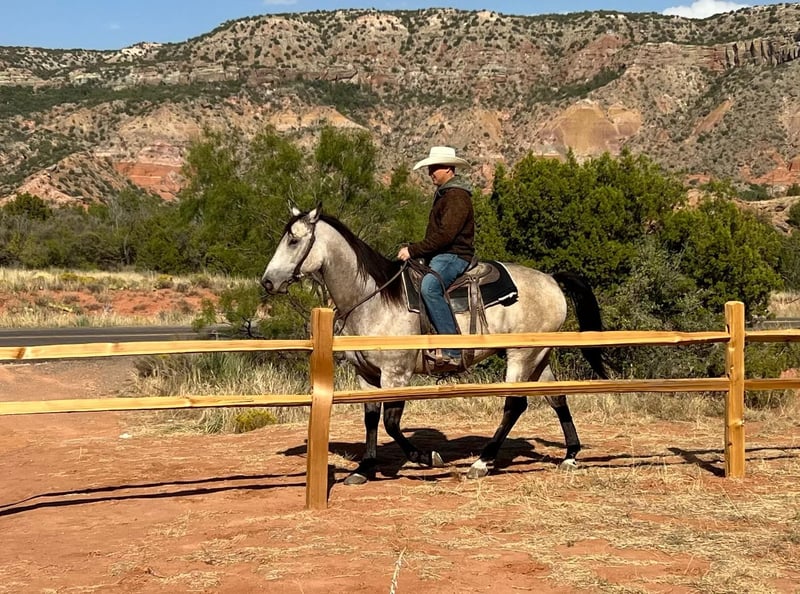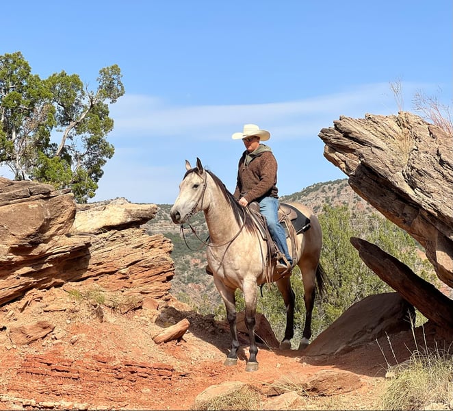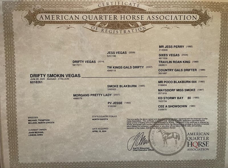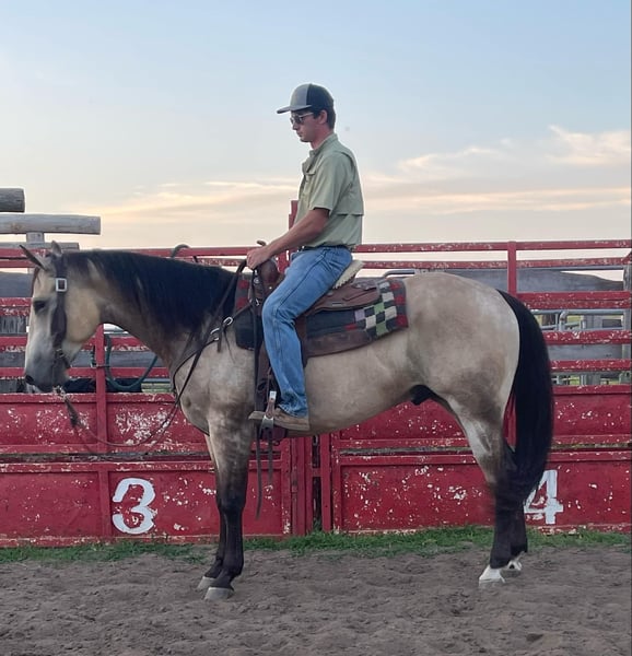 ONLINE AUCTION Place your bids at www.PlatinumEquineAuction.com Starting Bid $3500 Auction ends January 26th, 2025 Need a new saddle? Check out White Rock Saddles on our website or Facebook! Adrifty Smokin Vegas is a stunning 5 year old 15.3-hand buttermilk buckskin gelding weighing 1,400 pounds and standing out as an exceptional ranch prospect. Vegas has excellent bloodlines including Mr Jess Perry and Smokin Blackburn. Versatile and well-trained, he’s been used for a variety of jobs, from roping the hot heels and roping mule. Vegas has been on hundreds of miles of trails including Palo Duro Canyon, the Canadian Red River and Matzel Game Reserve multiple times. Vegas has been a trusted part of a lesson program, working with children & adults of varying skill levels. He is traffic safe and used to farm machinery including tractors & skid loaders. He is safe around dogs, cattle, and all other types of animals. We have used him to break colts to lead and pony our older contestant horses. Vegas has been patterned on the barrels and shown in 4H. He excels in trail competition and obstacles. Vegas has outstanding ground manners & is easy to catch, gets along well with other horses and ponies. and thrives on attention. Stands like a statue for the farrier, cross ties, bathes and clips perfectly. He will load in any size trailer from a 2 horse to a stock trailer. Vegas has had the best care including vaccinations, teeth, and worming. He has no allergies or bad habits. He is good in a stall or a pasture. Vegas is very willing to learn new job skills and is very talented. Vegas is very kind he has never offered to buck, kick, strike or bite ever. 100% sound in mind, body, and spirit, making him a reliable and well-rounded partner for any family. For further details or videos of this beautiful gelding, contact John McPhail 319-721-7714.
