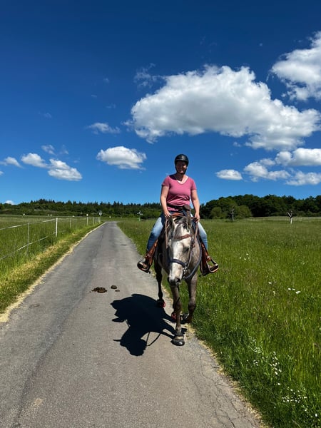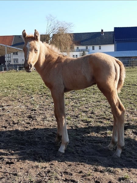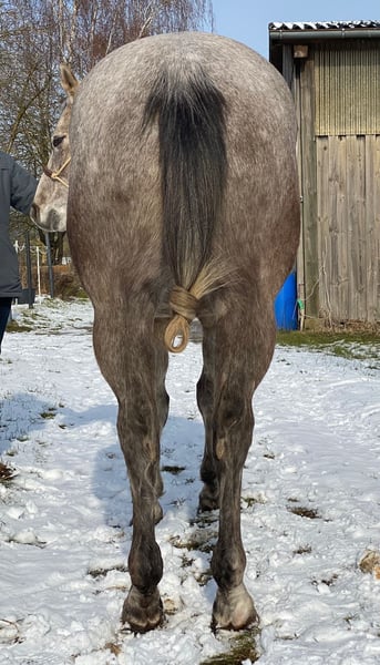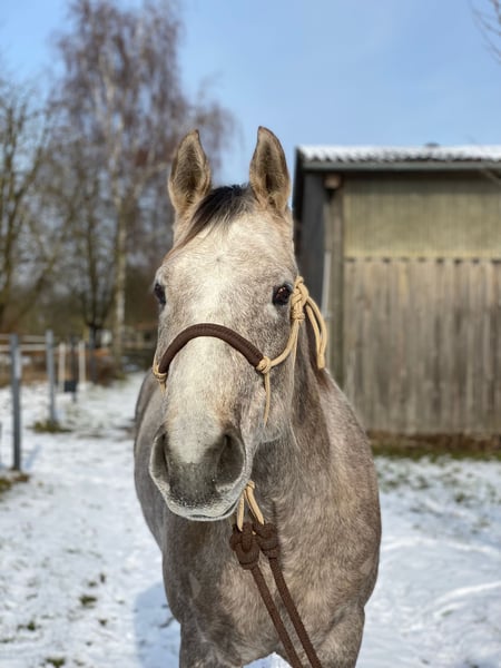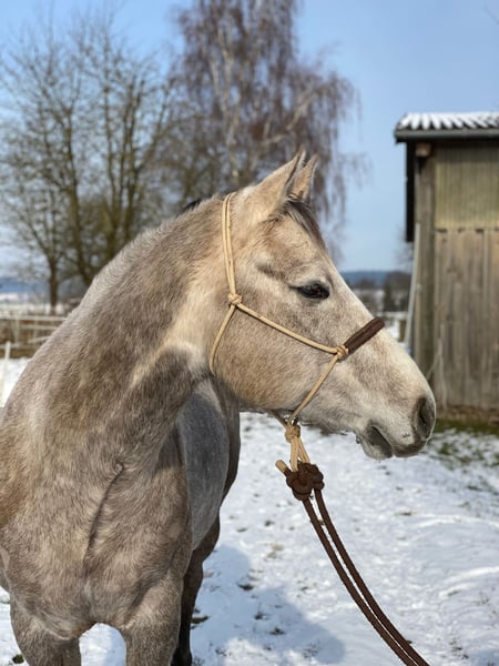 Sunny – 5-jähriger Quarter Horse-Wallach 🌟 Ich stelle vor: Sunny, ein wunderschöner, kräftig gebauter, angehender Schimmel, ca. 1,60 m großer, 5-jähriger Quarter-Horse-Wallach. Ein echter Hingucker mit eigenem Charakter, der Abwechslung liebt. Sunny findet endlose Runden in der Reithalle eher langweilig; er liebt Ausritte, Bodenarbeit oder ein abwechslungsreiches Vielseitigkeits- und Gelassenheitstraining? Da ist er für zu haben. Ein perfekter ruhiger Partner für Wanderritte, Zeit draußen verbringen, ob geritten oder spazieren gehen oder auch gemeinsame Urlaube. Er ist noch jung und lernt schnell. Er hat die Basis Ausbildung (Western) erhalten. Da er und ich nicht zusammen finden, wurde er bisher nicht aktiv weiter ausgebildet. Daher steckt noch ungenutztes Potenzial in ihm, wenn man ihn weiter fördern möchte. Auf ein paar Orientierungsritten war er schon unterwegs. Sunny braucht einen ihm angepassten Reiter, da er manchmal etwas eigenwillig und selbstsicher sein kann. Er braucht einen Reiter mit klaren Vorstellungen, Selbstvertrauen und einem Plan. Kann man ihm das geben, ist er ein ehrlicher und super Freizeitpartner. Das letzte Bild zeigt Sunny, als er paar Tage alt ist, also als Palomino geboren. * Ausbildungsstand: Kennt Reithalle, ausreiten mit anderen Pferde und sehr gerne auch alleine ein ganz treuer und zuverlässiger Partner. * Temperament: absolut gechillter Typ, lernbereit * Geeignet für: Reiter, die einen Geländefreund suchen, der sie überall hin trägt (Wanderreiter) Verladen überhaupt kein Problem. Beim Schmied ebenfalls brav (zurzeit beschlagen). Absolut sicher im Straßenverkehr. Esel, Traktor, Lkw, Bus, Schafe usw usw, alles kein Problem. Röntgenbilder vorhanden. Keine Lahmheit. Klinisch o.k. Er wird nur in ein 5-Sterne-Zuhause mit Gesellschaft und möglichst täglichem Weidegang vermittelt.