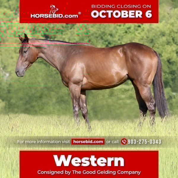 🍂 𝓐𝓾𝓽𝓾𝓶𝓷 𝑨𝑳𝑳 𝑺𝑻𝑨𝑹 𝑳𝑰𝑵𝑬𝑼𝑷 🍂 Happening now thru MONDAY | OCTOBER 6th - Available EXCLUSIVELY on HorseBid's website! For more details and to register visit: www.Horsebid.com CONSIGNOR CONTACT: The Good Gelding Company 903-275-0343 LOCATION: Athens TX BREED: Appendix REGISTERED: Yes REGISTERED NAME: Western Afleet COLOR: Bay HEIGHT: 16 AGE: 4 GENDER: Gelding Western is sweet, sensible, and lovable! At just 4 years old, this handsome bay gelding stands a solid 16 hands and already shows the maturity and kindness of an old soul. Western is as easy to have around as they come. He’s the first to meet you at the gate, easy to catch in the pasture, and the low man in the herd. In the barn, he absolutely adores his stall time and is known as the deepest sleeper in the whole place (we’ve even had to wake him up to make sure he’s not snoozing too hard 🫣). His quiet, gentle nature makes him a favorite among everyone who handles him. True to his name, Western is confident under saddle in both English and western tack. He loves riding outside, whether it’s trails, pastures, or obstacle courses, and takes everything in stride. He’s been exposed to sheep, goats, cows, llamas, deer, dogs, chickens, ducks, turkeys, and even a zedonk—proof of his level head and steady temperament. As an English prospect, Western has been started over jumps and is schooling lead changes. Soft in the bridle with a natural ability to carry himself, he’s already developing the balance and movement to stand out in the arena. His versatility makes him a fantastic candidate for a wide variety of disciplines. Western is the same horse whether he’s ridden every day or just once in a while. No drama, no silliness—just a reliable, willing partner who’s always ready for the next ride. For a young horse, his steady brain and trainable mind are what set him apart. He is current on farrier, dental, and all routine care.