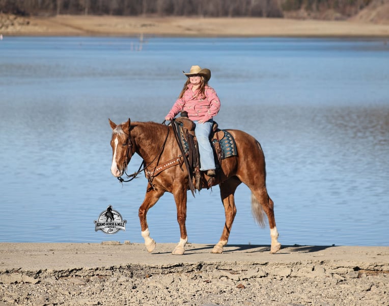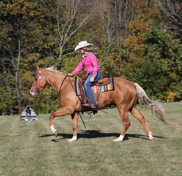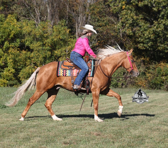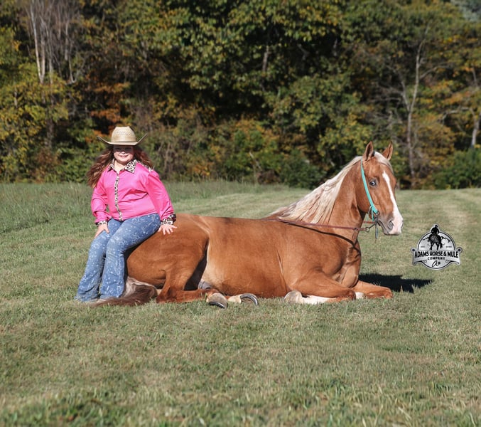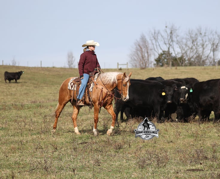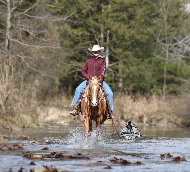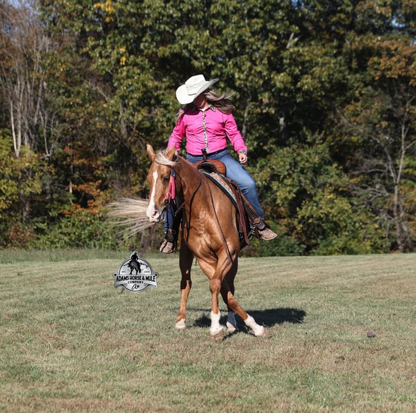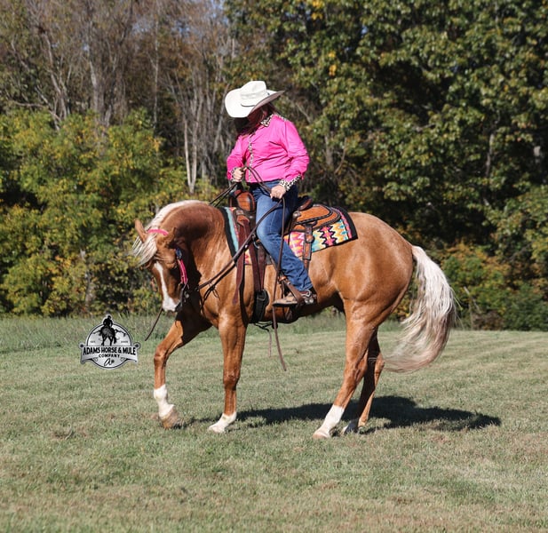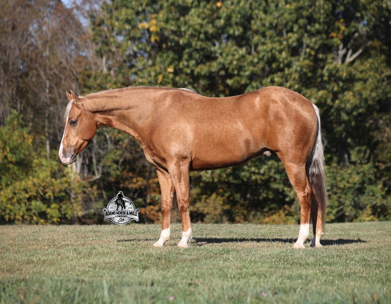 He is consigned to the COWGIRL CADILLACS Sale in Wickenburg, AZ on February 20-21st. You can bid online or bid in person. There is a preview day before the sale or you can come ride him prior to the sale in Mt. Vernon, KY. Register to bid at www.CowgirlCadillacs.com More info at www.AdamsHorseAndMuleCo.com $10000 starting bid CHEX this guy out!!! Gunners Whimpy Chex is a 2021 model reg AQHA, gelding that is standing 15.1hh with a very stocky build. Gunner has something to offer everyone… if you want pretty, he is wearing a golden coat, has a heart of gold and has four white socks with a thin blaze to go along with it, making a perfect combination of chrome and class. If you are a pedigree person… Gunner has an all-star lineup in his family tree, ML Gunnerito who is sired by the legendary Pale Face Dunnit, Hollywood Dun It, Colonels Smoking Gun, Gallo Del Cielo (AKA Rooster) and Nu Check To Cash… and he only gets more impressive once you get in the saddle! To start with Gunner is trained to lay down on cue. He knows all the reining maneuvers and would be a great horse to put in the ranch shows! He lopes nice circles, slowly on a draped rein, has a great stop, spins both ways, side passes to open/shut gates and has a good reverse. Gunner has a great mind, he is very laid back and loves attention. He enjoys being pampered by the kids whether that be a spa day with a bubble bath or getting glittered up for a photoshoot. Although he is a preppy guy, he is always up for a fun trail ride through the mud and rough country! Gunner has carried the kids through the rough rocky terrain, deep water, thick mud and up/down steep slopes. He has been ridden in several different states, never gets in a hurry and is very sure footed making him a great ride for a beginner type rider. Gunner has been roped off of out of the box on the heel side and he will put you in position to get an honest shot at the heels every time. He has been ridden around the ranch, herded, sorted and pasture roped. Things are always calm and quiet out on the trails and around the ranch but don’t worry, Gunner knows the sound of a roaring rodeo crowd of 3000 people, screaming and cheering as the speakers blare Kid Rock’s song “Born Free”, as he lopes around the arena carrying the flag at the grand entry. While at the rodeo Gunner was been used to sort, pen and load rodeo bulls. The girls also used him to give “pony rides” on at 4 different rodeos. They had all ages of kids and adults stand in line for a ride on their horses. Gunner has been ridden down the highways, through town, the drive thru, by Walmart and he will be traffic safe! He has been under English tack and will go over the rails with ease. Gunner is not spooky and has been around tarps, wind dancers, bull whips and gun fire. Gunner has been Movie Star good looks, an All-Star pedigree, Rideability, Safe, Smart, Experienced, Versatile… yes he certainly does CHEX all of the boxes!!! Gunner is available to ride and see in Mt. Vernon, KY until the week of the sale Feb. 16-21. Call for more info or if you have any questions 606-308-2461. Go to visit our website for more pics and a video www.AdamsHorseAndMuleCo.com AHAMC has been in the horse business and sold horses over the internet since 2005. We have a long track record of success with hundreds of happy customers. We work hard to match riders with the correct horses and specialize in beginner safe, family friendly horses that have been used and checked out by our family! We can set up transportation anywhere in the US and look forward to working with you. He is consigned to the COWGIRL CADILLACS Sale in Wickenburg, AZ on February 20-21st. You can bid online or bid in person. There is a preview day before the sale or you can come ride him prior to the sale in Mt. Vernon, KY. Register to bid at www.CowgirlCadillacs.com More info at www.AdamsHorseAndMuleCo.com $10000 starting bid