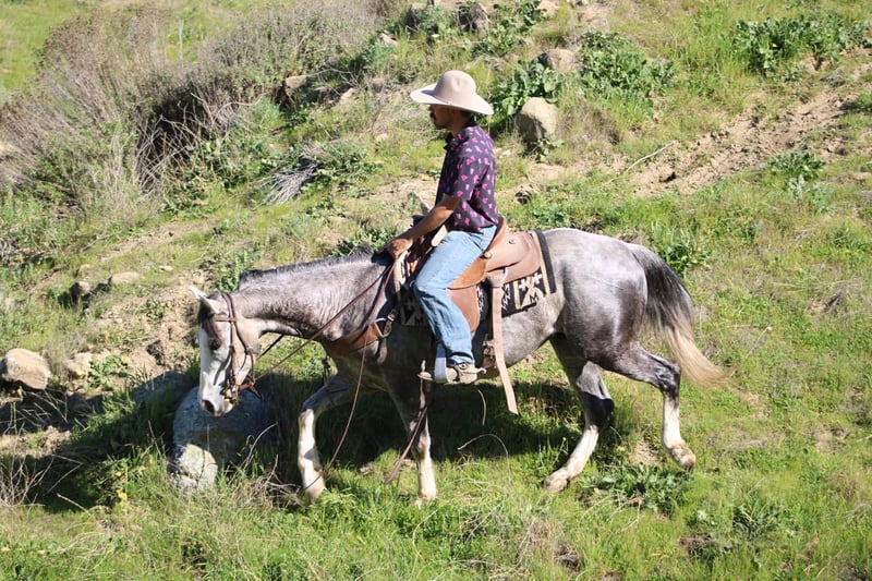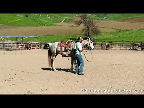 "AVAILABLE ON ONLINE HORSE AUCTION AT www DOT PlatinumEquineAuction DOT com BIDDING OPEN NOW thru SUNDAY | FEBRUARY 22ND! *Final price will be determined on auction site* CONSIGNOR CONTACT INFO: Longhorn Ranch 831-537-1915 LOCATION: Paicines, CA Booties Grey Gelding • 5 Years Old 14.3 hands If you appreciate a young horse with a big heart, a great mind, and a foundation that’s already heading in the right direction, Booties is one you’ll want to meet. This classy grey gelding with four white socks is the kind that makes you smile every time you ride him. He is extremely friendly, people-oriented, and a true pleasure to be around both in and out of the saddle. Booties has a solid start and works off a correct, uncomplicated foundation. He walks, trots, and lopes willingly, stays relaxed, and travels in nice, balanced circles. He carries himself with confidence and composure and feels more like a seasoned horse than one his age. Out on the trail, Booties is quiet, steady, and sensible. He goes along handling new surroundings with ease. He has been exposed to obstacles, flags, and tarps, and approaches everything with a calm, willing attitude. Nothing seems to worry this gelding — no buck, no bolt, and absolutely no silliness. Booties has been used to gather cattle and shows a lot of interest in them. We have roped the sled on him, and he is taking to it nicely, showing good try and a great attitude about his work. What truly sets Booties apart is his mind. He is level-headed, honest, and always tries to do the right thing. We feel he is gentle enough for beginners and would make a great youth horse with his willing, people-pleasing attitude, while seasoned riders will enjoy him just as much. Booties is such a pleasure to be around and ride, and truly feels like a special one in the making. Whether you’re looking for a solid trail partner, a nice arena horse, or a young horse to continue developing, Booties checks all the right boxes. Longhorn Ranch Paicines, California Dina – 831-537-1915 Shipping assistance available nationwide.