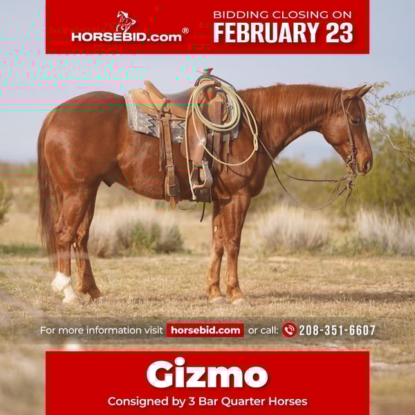 💎 𝐓𝐇𝐄 𝓓𝓲𝓪𝓶𝓸𝓷𝓭 𝐒𝐇𝐎𝐖𝐂𝐀𝐒𝐄 💎 Happening now thru MONDAY | FEBRUARY 23rd - Available EXCLUSIVELY on HorseBid's website! For more details and to register visit: www.Horsebid.com CONSIGNOR CONTACT: 3 Bar Quarter Horses 208-351-6607 LOCATION: Aguila, AZ BREED: QH REGISTERED: Yes REGISTERED NAME: Chilin On My Scooter COLOR: Sorrel HEIGHT: 14.3 AGE: 6 GENDER: Gelding “Gizmo” is a 6 year old son of the legendary Scooter Cat who is the highest earning reined cow horse of all time. LTE of over 678,000 and still showing, and a proven producer as well. “Gizmo” was started in a cow horse program, is solid in all maneuvers and was ready to be shown when human life happened and his career path got changed. An incredible athlete that could go excel a number of different directions. He has been used outside and has done all the basic ranch jobs. Knows how to get through rough terrain, and is an incredible traveler. He is a big motored horse that likes to go do a job, gritty, with a lot of try. Tune him up and go show him, or take him to the sorting pen and go win! Gizmo has a willing disposition and has been in good hands all his life. Polite to shoe, bath, load/haul, etc questions call or text 208-221-1090