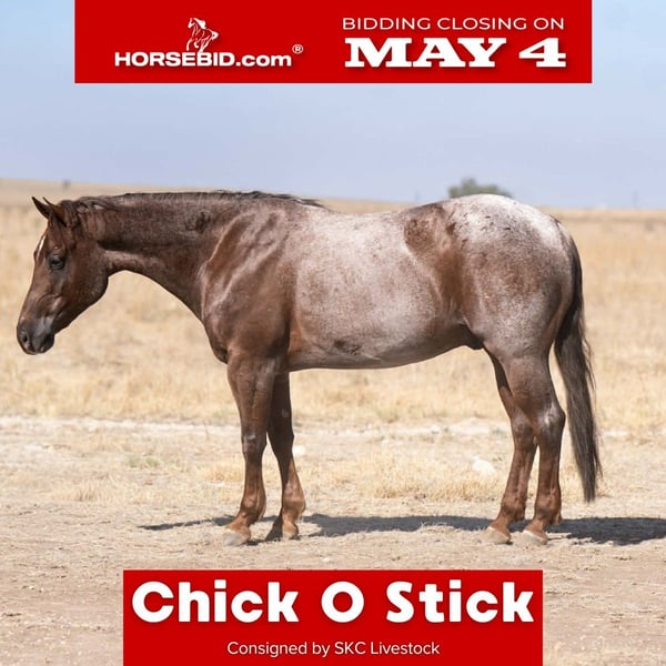 ▪️▫️◾️𝐭𝐡𝐞 𝑴𝒂𝒚 𝐒𝐞𝐥𝐞𝐜𝐭◾️▫️▪️ Happening now thru MONDAY | MAY 4th - Available EXCLUSIVELY on HorseBid's website! For more details and to register visit: www.Horsebid.com CONSIGNOR CONTACT: SKC Livestock 806-282-7093 LOCATION: Canyon, TX BREED: Quarter Horse REGISTERED: Yes REGISTERED NAME: Hickory's Drive Time COLOR: Red Roan HEIGHT: 15 AGE: 6 GENDER: Gelding Chic O Stick is a cute 5 yr old red roan gelding standing exactly 15 hands, with plenty of bone good confirmation and full of personality. Chico is smooth easy going and a pleasure to be around. Sired by Hickory Holly Time, (LTE of over 230,000) making him eligible for the Riata Buckle, The Royal Crown Roping and the NRCHA Cow Horse Incentive. Chico has been trained in the cow horse and could continue to show there, he circles great, can really stop and has extra nice spins. He is soft and has enough feel for the advanced riders to enjoy him but he’s quiet and forgiving enough for an absolute beginner too. He would also be a fantastic candidate for the Ranch classes he has clean soft transition up or down. A cool long trot, beautiful movement, he would stand out in the steer stopping, and Kyle do the obstacles phenomenal, and just has a presence the judges loves. Chico has a fantastic start in the heeling too. He’s ready to go jackpot on. He scores great, makes the corner and just drags his rear end every time. But if you’re not a show horse guy go take Chico outside he shines just as much. He crosses water and rocky terrain he’s quiet and thoughtful about where he puts his feet. He’s trotted out many mornings to gather and ship wheat cattle. He’s great to doctor on outside. Just complete solid citizen in or out of the arena. This horse is also youth suitable, the last month we have let a youth cow horse on him and he never takes advantage. He’s solid on the fence, circles great and is gritty in the boxing. This horse has so many different avenues he could go down. The best part about him he STAYS GENTLE with all the time off and all the feed he still saddles back up level headed and gentle as can be. This horse will radiograph clean, will pass a PPE and you are welcome to call us to get one scheduled, he has great bone, good feet, can go shod or barefoot and requires no maintenance at all.