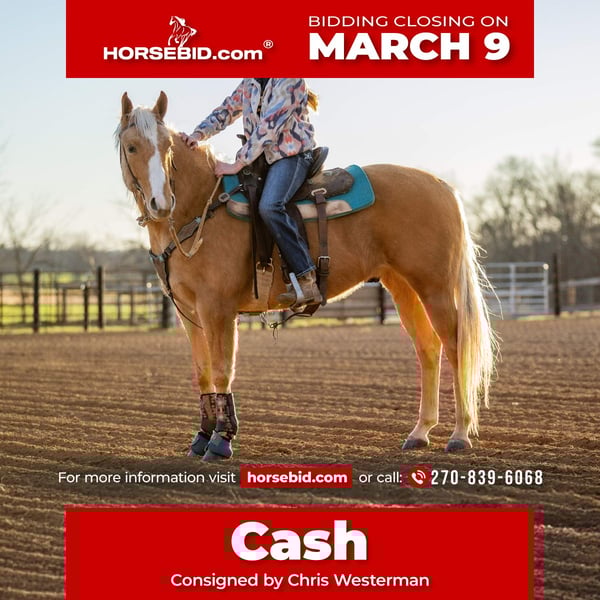 ℳ𝒶𝓇𝒸𝒽 ♦️𝐑𝐈𝐃𝐄𝐑'𝐒 𝐂𝐇𝐎𝐈𝐂𝐄♦️ Happening now thru MONDAY | MARCH 9th - Available EXCLUSIVELY on HorseBid's website! For more details and to register visit: www.Horsebid.com CONSIGNOR CONTACT: Chris Westerman 270-839-6068 LOCATION: Trenton, KY BREED: AQHA REGISTERED: Yes REGISTERED NAME: Check Your CD Cash COLOR: Palomino HEIGHT: 15.1 AGE: 6 GENDER: Gelding Cash is a six year old ready for you to take him to the next level. He has seen the barrel pattern, been started on both sides of the roping box, has been used to pasture rope baby calves, and conquered numerous trails. His hustle and quick feet give him the ability to be an all around horse.