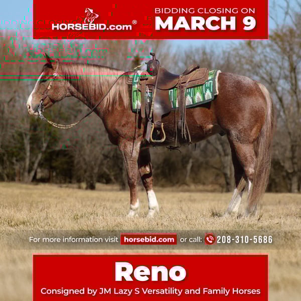 ℳ𝒶𝓇𝒸𝒽 ♦️𝐑𝐈𝐃𝐄𝐑'𝐒 𝐂𝐇𝐎𝐈𝐂𝐄♦️ Happening now thru MONDAY | MARCH 9th - Available EXCLUSIVELY on HorseBid's website! For more details and to register visit: www.Horsebid.com CONSIGNOR CONTACT: JM Lazy S Versatility and Family Horses 208-310-5686 LOCATION: Baxter Springs, KS BREED: AQHA REGISTERED: Yes REGISTERED NAME: CM Flyin Rey COLOR: Red Roan HEIGHT: 15.1 AGE: 6 GENDER: Gelding If you’re looking for a finished gelding who’s broke, seasoned, confident, and stunning to look at—CM Flyin Rey, “Reno,” is the real deal. This 2020 AQHA red roan gelding stands 15.1 hands with presence, maturity, and eye appeal to spare. He’s the total package: ranch-proven, arena-polished, and quiet enough to enjoy anywhere. Reno was raised and used on a large-scale cattle operation and has done every ranch job imaginable—gathering rough country, dragging calves, sorting tight, doctoring outside, and handling sale barn chaos. He’s cowy, gritty when needed, and confident in close quarters. He knows gates, holds pressure, and positions himself naturally on cattle. In the arena, he’s incredibly well broke with all the buttons—soft in the bridle, smooth transitions, correct turnarounds, solid stop, fluid sidepass, and rides one-handed or bareback in a halter. He lopes collected circles, picks up both leads with ease, and stays between the reins without babysitting. He recently just came home from 4 months of ranch versatility training and even dipped his toes in a local show. Just as impressive as his ability is his mind. Reno is kind, level-headed, easy to catch, great to shoe, haul, and stand tied. He’s comfortable around dogs, livestock, and commotion, and handles work or downtime with the same steady attitude. He’s been brought along correctly with a strong foundation and thoughtful finishing—young, seasoned, broke, and beautiful, not to mention he LOVES people and is already ready to spend the day with you. Reno is backed by generations of proven performance bloodlines. Sired by Boo Rey Dr, a son of High Roller Rey ($51,000+), and out of Flyin Nancy, whose pedigree traces to Prices Husker Leo and Rondo Leo, he carries elite blood with horses that are successful in the NRCHA, NCHA, AQHA, and barrel racing disciplines, he's bred for cow, athleticism, and versatility. Reno is also current on absolutely everything. He’s up to date on dental work, routine chiropractic care, vaccinations, deworming, and farrier maintenance. He’s been managed with care and consistency, and it shows in his health, soundness, and demeanor.Call or text John: (208)310-5686 or Molly (208)566-3050