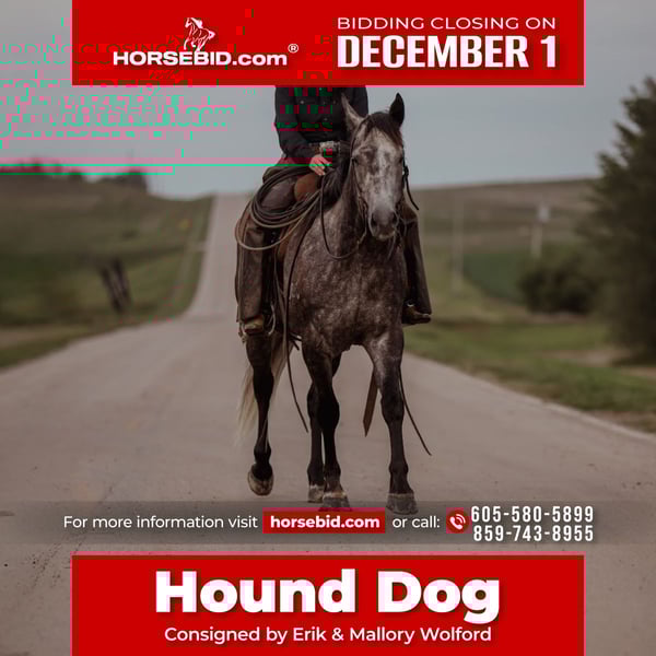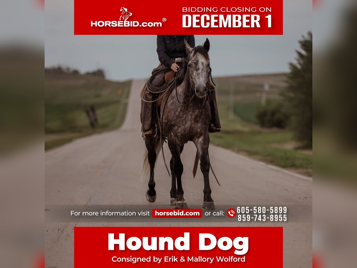 ⚜️ 𝓽𝓱𝓮 𝐇𝐨𝐫𝐬𝐞𝐦𝐚𝐧'𝐬 𝓢𝓱𝓸𝔀𝓬𝓪𝓼𝓮⚜️ Happening now thru MONDAY | DECEMBER 1st - Available EXCLUSIVELY on HorseBid's website! For more details and to register visit: www.Horsebid.com CONSIGNOR CONTACT: Erik & Mallory Wolford 605-580-5899 or 859-743-8955 LOCATION: Whitewood, SD BREED: American Quarter Horse REGISTERED: Yes REGISTERED NAME: Guys Grey Badger COLOR: Grey HEIGHT: 15.1 AGE: 5 GENDER: Gelding Hound Dog is the kind you look a long time to find. We’ve had him since he was a yearling, and he’s been used for every aspect of ranch work — calving, sorting, branding, pasture roping, doctoring, and long days in all weather. He’s the one we trust to pack me and our 12-month-old son around without a worry. He’s started in the heeling out of the box and had 60 days of barrel training as a 4-year-old. Athletic, cowy, and ready to go on with in any direction. With more focused time, he’ll make someone a really nice rope horse. He also comes with good papers, going back to Mr Illuminator and Guys Gotta B Tough — a pedigree known for brains, bone, and real-deal using horses. ✔️ Sound, good-made, and easy to catch ✔️ Loads, hauls, and saddles without nonsense ✔️ No vices — honest, willing, and loves having a job ✔️ Solid ranch foundation + started in the arena ✔️ Seen everything and stays steady Hound Dog is a very special gelding that truly can do it all.