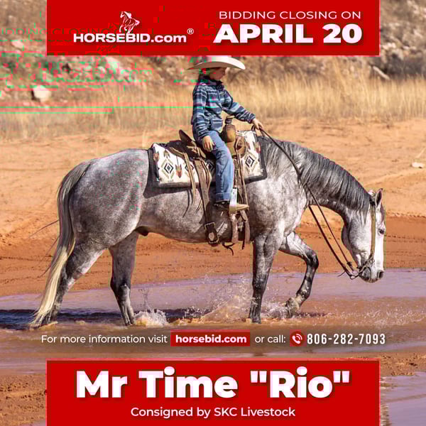 ⚜️𝐭𝐡𝐞 𝓔𝓵𝓲𝓽𝓮 𝐒𝐩𝐫𝐢𝐧𝐠 𝐂𝐥𝐚𝐬𝐬𝐢𝐜⚜️ Happening now thru MONDAY | APRIL 20th - Available EXCLUSIVELY on HorseBid's website! For more details and to register visit: www.Horsebid.com CONSIGNOR CONTACT: SKC Livestock 806-282-7093 LOCATION: Canyon, TX BREED: Quarter Horse REGISTERED: Yes REGISTERED NAME: MR TIME COLOR: Grey HEIGHT: 15.1 AGE: 6 GENDER: Gelding