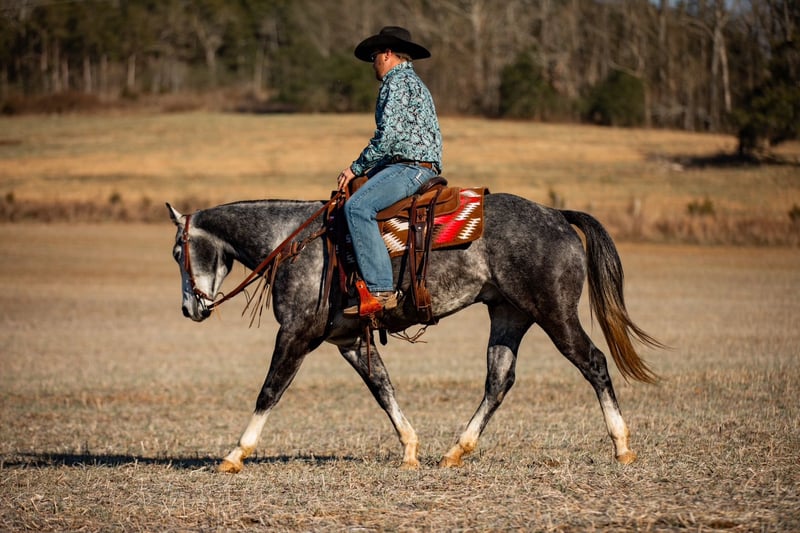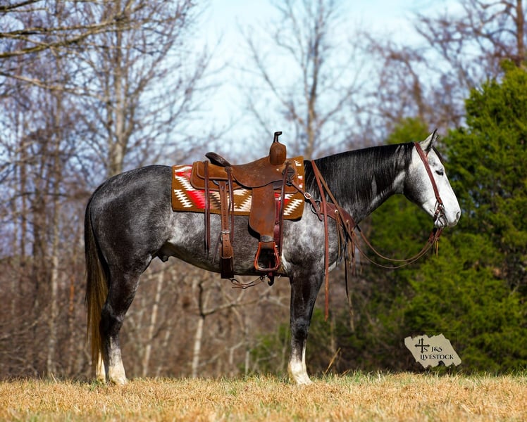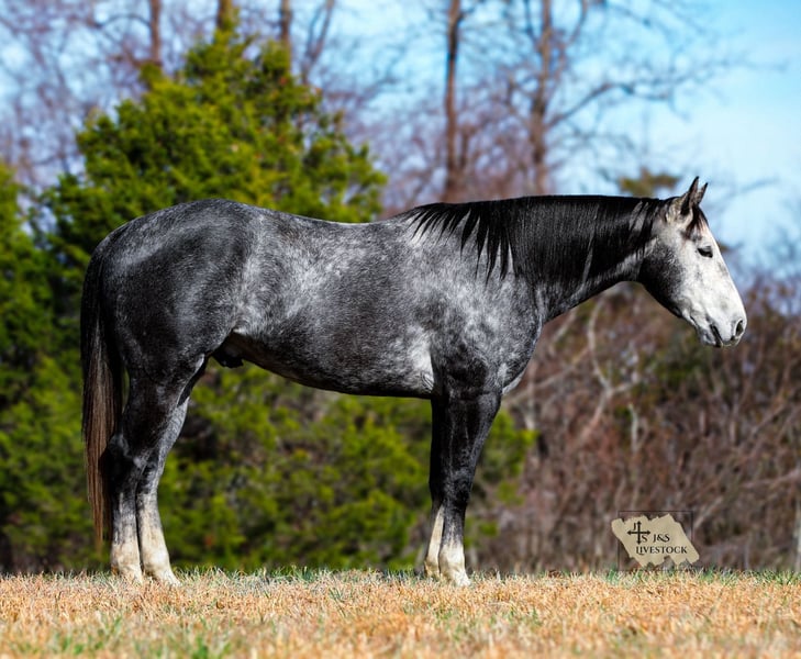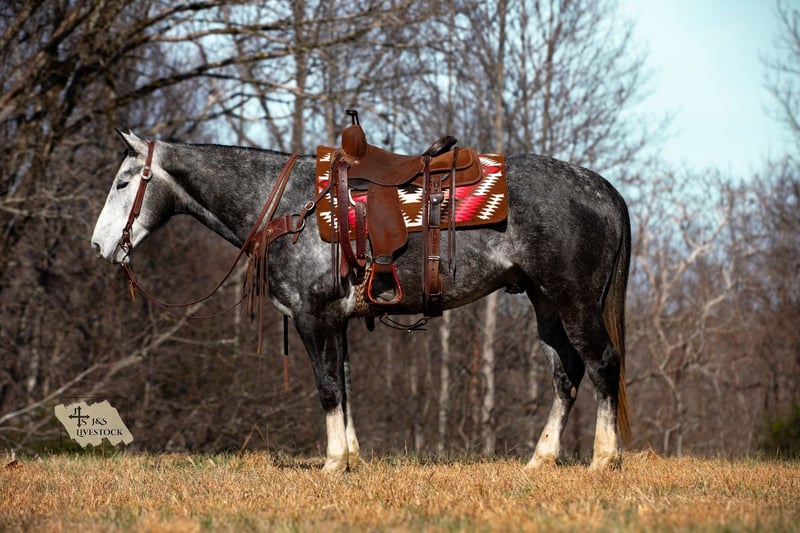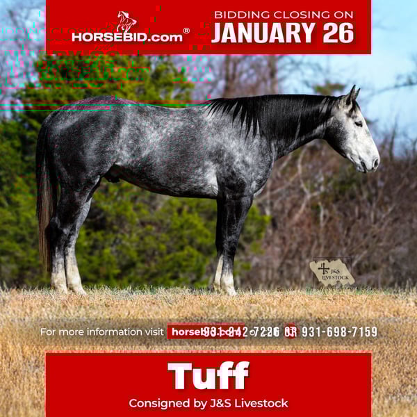 𝐉𝐀𝐍𝐔𝐀𝐑𝐘 ⭐️𝑨𝒍𝒍 𝑺𝒕𝒂𝒓 𝑳𝒊𝒏𝒆𝒖𝒑⭐️ Happening now thru MONDAY | JANUARY 26th - Available EXCLUSIVELY on HorseBid's website! For more details and to register visit: www.Horsebid.com CONSIGNOR CONTACT: J&S Livestock 931-242-7226 or 931-698-7159 LOCATION: Santa Fe, TN BREED: Quarter Horse REGISTERED: Yes REGISTERED NAME: TEE JS TUFF ONYX COLOR: Dapple Iron Grey HEIGHT: 15.1 AGE: 6 GENDER: Gelding TEE JS TUFF ONYX Meet Tuff- a stop you in your tracks, drop-dead gorgeous iron grey gelding, with the sweetest soul you could want. With such beautiful confirmation, lovely headset, and the kindest eye you can see from the moment you meet him comes with an even better attitude- he is always so willing with whatever you ask of him and is always up for learning new things, even if it may be challenging. He is definitely an in-your-pocket type gelding, he loves attention and soaks it all in. He wants to be your friend and please you all in one. Standing 15.1 hands tall and 5 years old, Tuff sure has seen a lot at a young age. He has great manners- easy to catch, bathe, saddle, ties quietly, and loads in and out of the trailer great. He does good turned out or stalled- he does tend to appreciate the head scratches that comes with being stalled from time to time! Aside from his wonderful temperament, he is an excellent trail/ranch horse. He is safe and steady on various terrains and navigates through it all like a pro- deep water, fallen down timber, slippery and rocky ground, etc. He is strong, stout and very capable of carrying any rider with ease. Tuff also handles well to noisy traffic or loud machinery. He even handles mini donkeys/ ponies out in the pasture squealing and trying to chase you, with such kindness! Lol. He has also done some ranch work where we have personally used him to check cows and to push cattle around with. We have used him lightly to rope some calves out in the pasture on as well. I personally feel Tuff would excel great into several different disciplines if you choose to take him in that direction, and is at that perfect age to still learn new things! He is responsive, moves off leg pressure, and has nice, comfortable gaits. You can ride him on a beautiful loose rein or by making more contact you can ride him more direct- whatever you choose. With that being said, Tuff is an excellent, brilliant minded, and kindhearted gelding that anyone would be proud to own. He truly is a pleasure that we are proud to offer. Tuff is 100% sound and has a very recent PPE (1-6-2026) and passed with flying colors. If you have any more questions on Tuff, don’t hesitate to reach out at anytime! Bailey 931-242-7226.