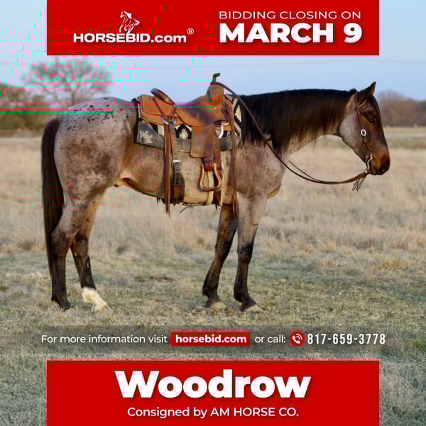 ℳ𝒶𝓇𝒸𝒽 ♦️𝐑𝐈𝐃𝐄𝐑'𝐒 𝐂𝐇𝐎𝐈𝐂𝐄♦️ Happening now thru MONDAY | MARCH 9th - Available EXCLUSIVELY on HorseBid's website! For more details and to register visit: www.Horsebid.com CONSIGNOR CONTACT: AM HORSE CO. 817-659-3778 LOCATION: Mineral Wells, TX BREED: AQHA REGISTERED: Yes REGISTERED NAME: RW Woodrow COLOR: Bay roan HEIGHT: 15.2 AGE: 6 GENDER: Gelding Woodrow is the kind you don’t come across every day. This 6 year old AQHA bay roan gelding stands 15.2hh, is stout, well-built, and has the kind of temperament everyone is searching for. Whether you want a safe mount for the whole family, a reliable partner for ranch work, or a versatile all-around gelding, Woodrow checks every box. Woodrow has truly done it all. He has been trail ridden extensively, ridden both English and Western, taken over small jumps, and even roped on in and out of the arena. No matter what you point him at, he gives 100% with a calm, willing attitude. On the trail, he’s confident and steady, going through water, up and down hills, and across new terrain without hesitation. In the arena, he is responsive, soft, and smooth to ride. His greatest quality, however, is his dependability. Woodrow is safe for kids, beginners, and husbands, yet broke and versatile enough for a more experienced rider to enjoy. He’s forgiving, kind, and always consistent, and is the same horse every time you saddle him. He’s the type you can trust to take care of his rider. On the ground, Woodrow is just as easy. He stands quietly for grooming, saddling, the farrier, and the vet. He loads and unloads with no fuss, hauls well alongside other horses, and ties to the trailer patiently. He gets along well in a mixed herd but is also content in a stall. Sound, safe, and honest, Woodrow is the kind of gelding that instantly becomes a barn favorite. He is versatile, steady, and seasoned, making him a perfect fit for a family, a beginner, or anyone who simply wants a dependable, trustworthy horse. We love Woodrow, and he deserves the very best home. Horses like him don’t come around often, and we are excited to see him make someone else’s dreams come true. We are located in ♦️Mineral Wells Texas♦️but have reputable haulers that go all over the country, including Hawaii and Canada. Give me a call or text and I’d be happy to answer any questions! 817-659-3778