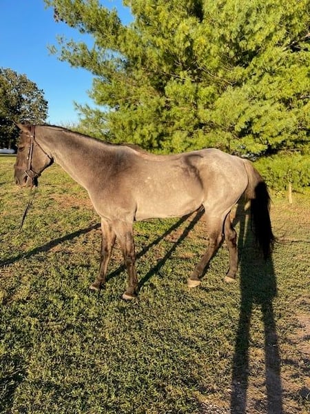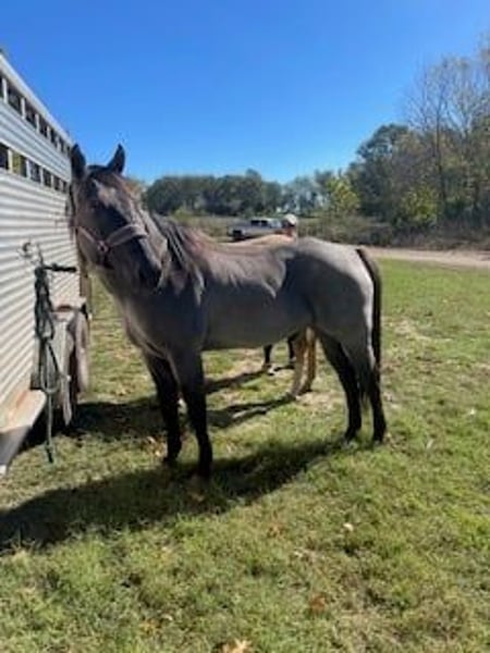 ONLINE AUCTION Place your bids at www.PlatinumEquineAuction.com Starting Bid $3500 Auction ends November 23rd, 2025 Need a new saddle? Check out White Rock Saddles on our website or Facebook Up for grabs is Big Blue, a handsome 5-year-old true blue roan draft cross gelding standing 16 hands tall – the kind of horse that’s built tough and ready for whatever you throw at him. With his striking blue roan color and sturdy draft cross frame and fine head, he’s got the looks and the muscle to handle trails, ranch work, the show arena, or just fun easy riding. He’s as straightforward and dependable as they come. Big Blue’s got a calm, easy-going personality – he stands quietly for all the things from farrier work to tacking and vet work, and he loads real easy as shown in the video. Out on the trails, he’s steady as can be and crosses scary old bridges (see video), etc., with ease. He has a comfortable trot and a very smooth, comfortable, easy lope. Nice stop and back. He’s gentle enough for the kids, grandparents, and neighbors that you like, but also has the drive for more experienced riders looking to put miles on him. He’s built stocky and sound with good bone. Big blue is a versatile horse that’s fun to own and easy to get along with. Located exactly in the middle of the country in the Ozark mountains in Springfield, Missouri. For more info contact Scott Montgomery 417-827-3866. ONLINE AUCTION Place your bids at www.PlatinumEquineAuction.com Starting Bid $3500 Auction ends November 23rd, 2025 Need a new saddle? Check out White Rock Saddles on our website or Facebook