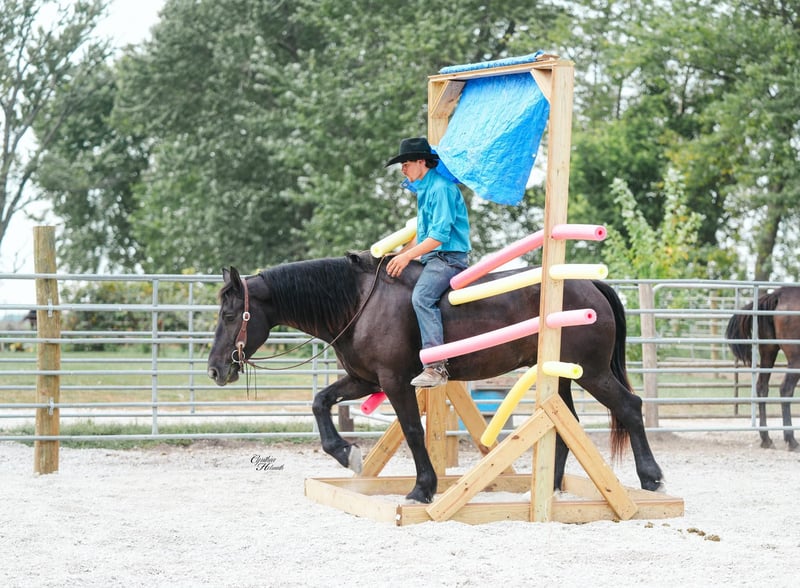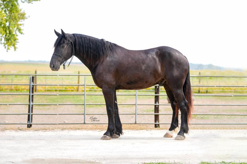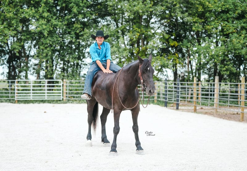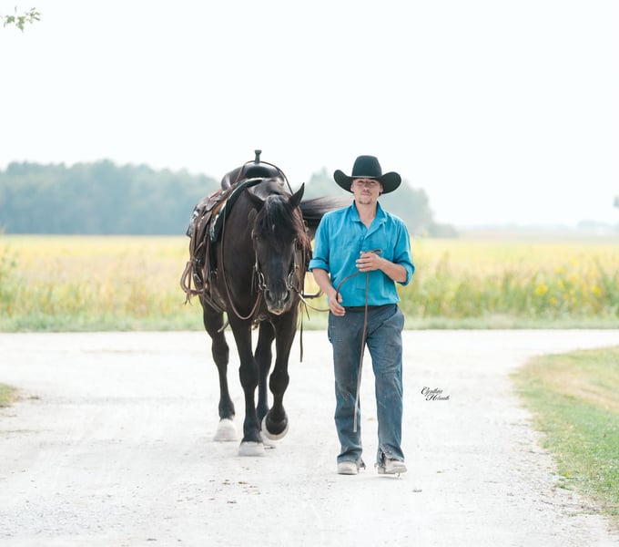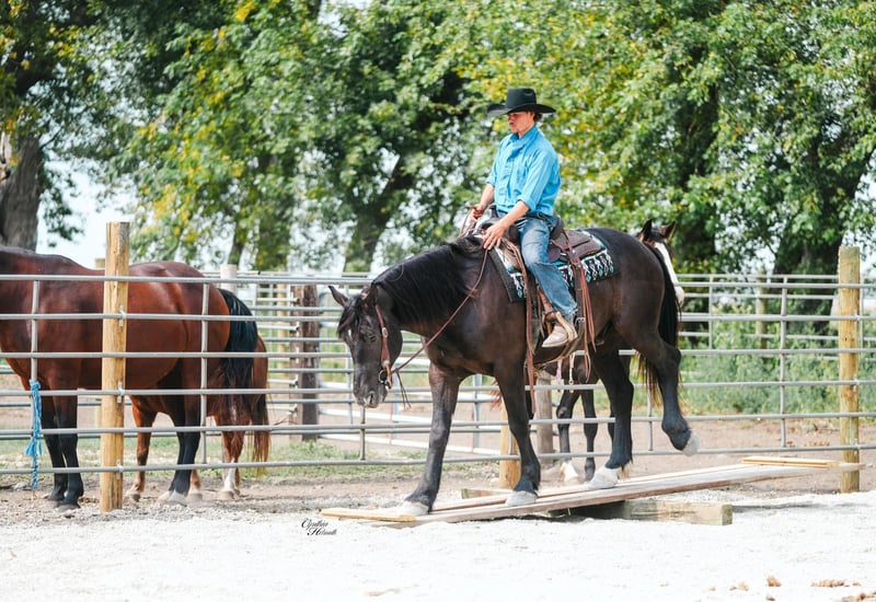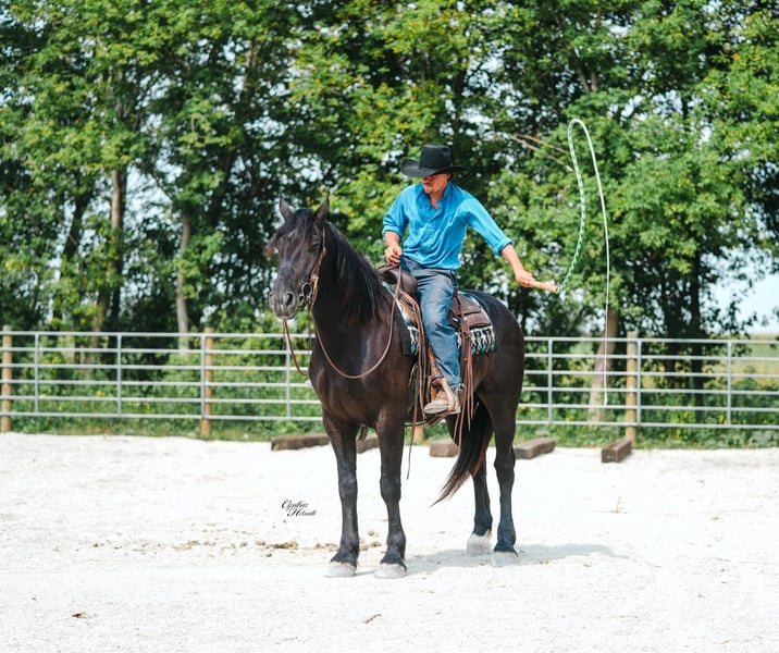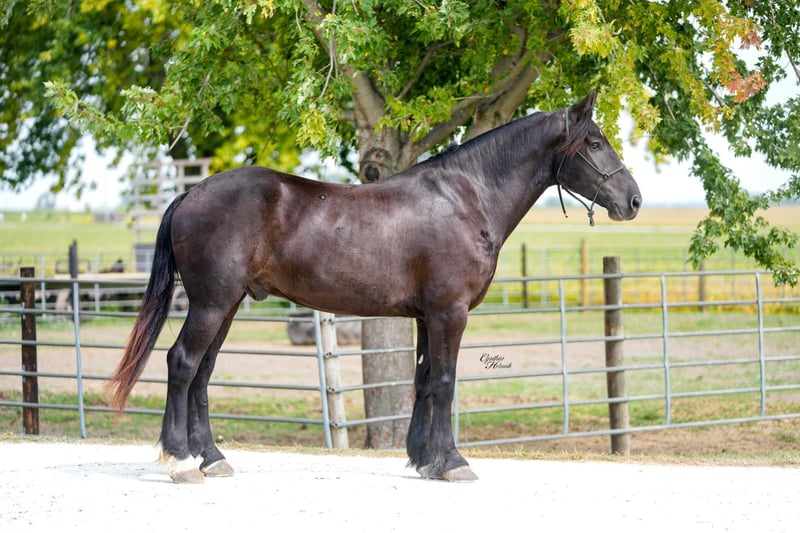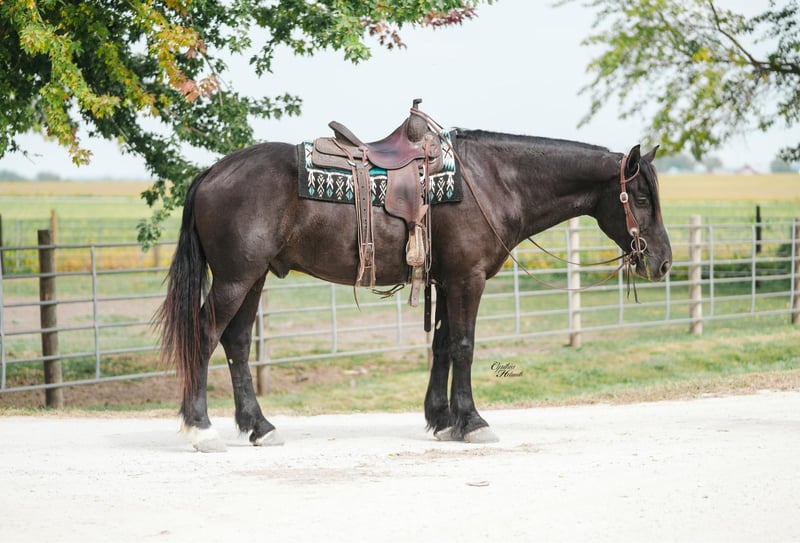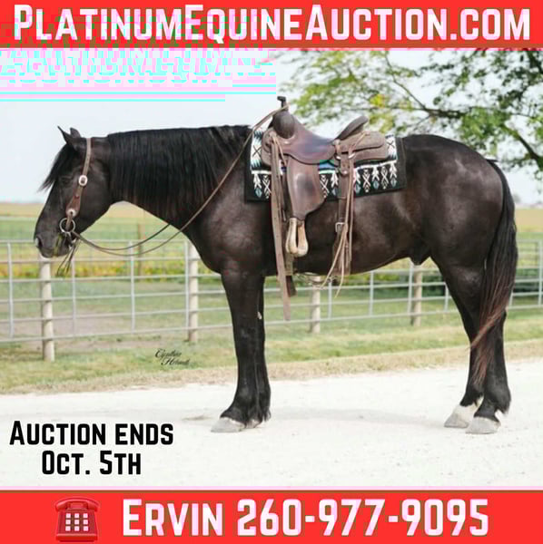 ONLINE AUCTION Place your bids at www.PlatinumEquineAuction.com Starting Bid $3500 Auction ends October 5th, 2025 Need a new saddle? Check out White Rock Saddles on our website or Facebook Trevor is a striking jet black, 5 year old, draftcross gelding who stands a solid 16h and is very stocky built. He is well broke to ride and drive single or double. He performs equally well in the arena or out on the trails. He will cross logs, ditches, muddy areas, scale steep slopes and handle rocky terrain with ease. He is totally confident, seasoned and very sure footed. He is happy to go alone or anywhere in a group setting. Trevor is totally quiet, a true family horse that any member of all ages can and will enjoy as he builds his riders confidence. In the arena he is well trained. He lopes nice circles, takes the correct leads, one hand neckreins, has a good stop, backs, and side passes. Trevor is very friendly, he will meet you at the gate and loves attention. He just wants to be everyone’s best friend! Whether you ride him once a month or twice a year he will always be the same safe, smart and gentle horse! He sells 100% sound and sane. For more info call Ervin Hershberger 260-977-9095 with any questions. Located in Independence, IA. ONLINE AUCTION Place your bids at www.PlatinumEquineAuction.com Starting Bid $3500 Auction ends October 5th, 2025 Need a new saddle? Check out White Rock Saddles on our website or Facebook