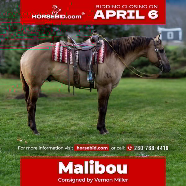 🌟𝑨𝒑𝒓𝒊𝒍 𝐀𝐋𝐋 𝐒𝐓𝐀𝐑 𝐋𝐈𝐍𝐄𝐔𝐏🌟 Happening now thru MONDAY | APRIL 6th - Available EXCLUSIVELY on HorseBid's website! For more details and to register visit: www.Horsebid.com CONSIGNOR CONTACT: Vernon Miller 260-768-4416 LOCATION: Shipshewana, IN BREED: AQHA REGISTERED: Yes REGISTERED NAME: Rio Yankee COLOR: Grullo HEIGHT: 16.2 AGE: 6 GENDER: Gelding Rio Yankee or Malibou as we call him is a gorgeous 16.2 HH Registered AQHA grullo gelding. This big boy quickly became the barn favorite. If you don't fall in love with his color you sure will with his big heart. Malibou is a dream to ride. He listens to leg and seat cues, making him a breeze to ride. Malibou has been on lots of trails and on the road; traffic doesn't faze him at all. He will cross logs, water, brush, or any other obstacle you may meet on the trail. He rides great in the arena as well. He picks up both leads and lopes in a nice circle. He will definitely build your confidence. Malibou has also helped move our stock and is not afraid of camels, longhorns, ostriches, and many other animals. Malibou also rides in English tack and we have taken him over jumps and he loves it. And he rides bareback just as well. Malibou is ready to be a family or personal companion. If you think this is the handsome boy you have been looking for please give us a call or if you wish to test ride him. Please call 260-768-4416.