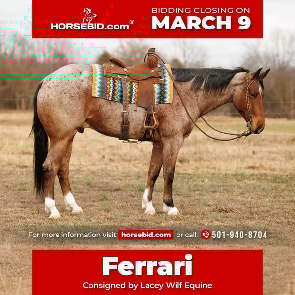 ℳ𝒶𝓇𝒸𝒽 ♦️𝐑𝐈𝐃𝐄𝐑'𝐒 𝐂𝐇𝐎𝐈𝐂𝐄♦️ Happening now thru MONDAY | MARCH 9th - Available EXCLUSIVELY on HorseBid's website! For more details and to register visit: www.Horsebid.com CONSIGNOR CONTACT: Lacey Wilf Equine 501-940-8704 LOCATION: Quitman, AR BREED: Quarter Horse REGISTERED: No COLOR: Bay Roan HEIGHT: 16.2 AGE: 6 GENDER: Gelding Ferrari is the kind that makes you rethink your standards. At 6 years old and standing a commanding 16.2 hands, this bay roan Quarter Horse gelding is equal parts presence and practicality. He’s a “point him and go” type that rides out solo with confidence or falls quietly into a group without drama. Water, logs, ditches, rough country, uneven ground… he handles it all like it’s just another day at the office. No theatrics. No hesitation. Just steady. In the arena, he’s refreshingly uncomplicated. He picks up both leads with ease, stays soft in the bridle, and responds honestly to leg pressure. His stop is correct, his rollback is balanced, and his lope is a true rocking chair you could sit on all afternoon. Smooth, cadenced, and easy to stay with. Switch tack and he steps into English just as naturally, carrying himself with a balanced, forward way of going and a polished headset that makes him look every bit as good as he feels. His impressive resume extends far past the arena. Ferrari has been used extensively at the stockyards, penning, sorting, and loading cattle with confidence and sense. Town traffic doesn’t phase him either. Noise, movement, pressure… he stays the same horse. On the ground, he’s just as solid. He’s easy to catch, groom, saddle, bathe, load, and shoe. He gets along well with other horses and is just as content in a stall as he is turned out in the pasture. No fuss. No nonsense. Big, broke, and built to cover ground with ease, Ferrari is 100% sound and ready to go on with. He’s the kind that doesn’t need babysitting or micromanaging. He shows up, does his job, and makes the ride enjoyable every single time! Watch his full Youtube video, feel free to reach out with any questions, and arrange a visit or a FaceTime with Ferrari!