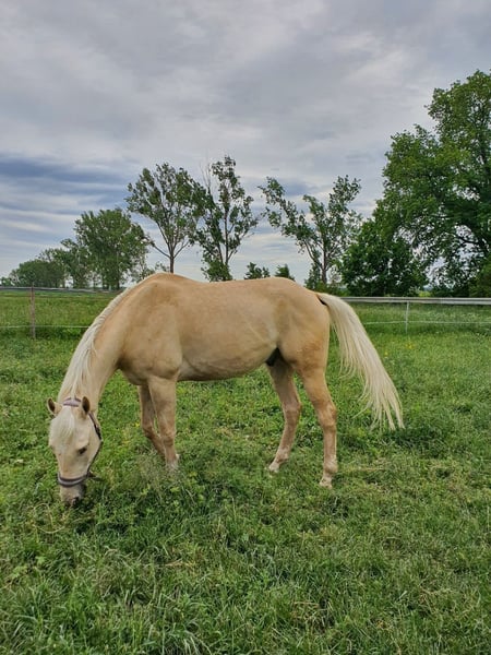 Dear Gelding born in 2020, I purchased this horse as a yearling and have trained him myself. He performs well in dressage and had his first competitions this summer. He is gentle and easy to handle, getting along well with other horses. He is also comfortable riding alone in the arena and on the trail (group rides are no problem either). He loads easily onto the trailer, and handling the farrier and veterinarian is no issue. Regular care has always been maintained, including dental work and health checks. His sire is a Quarter Horse, and his dam is a Warmblood. He has smooth and comfortable gaits. This is not a child's or beginner's horse; he still requires further training and development.