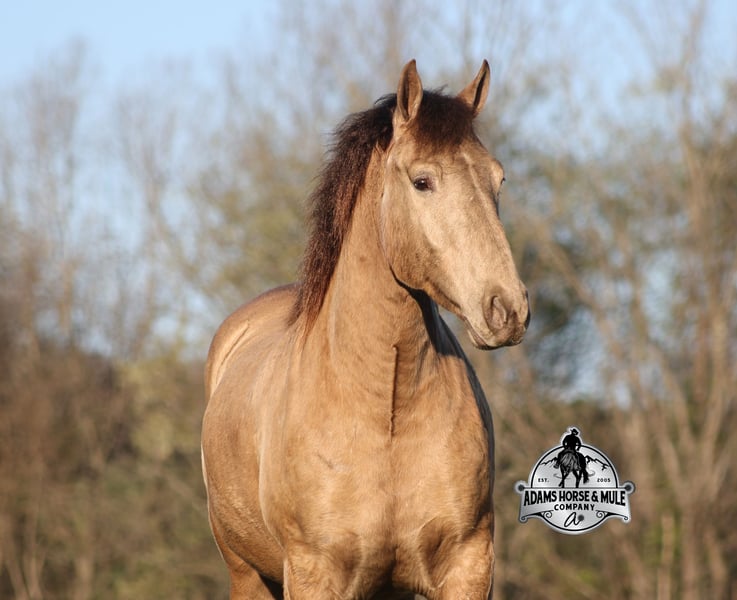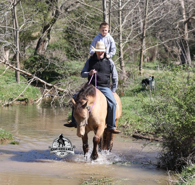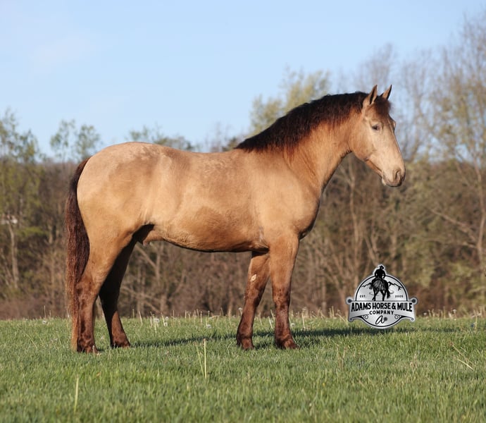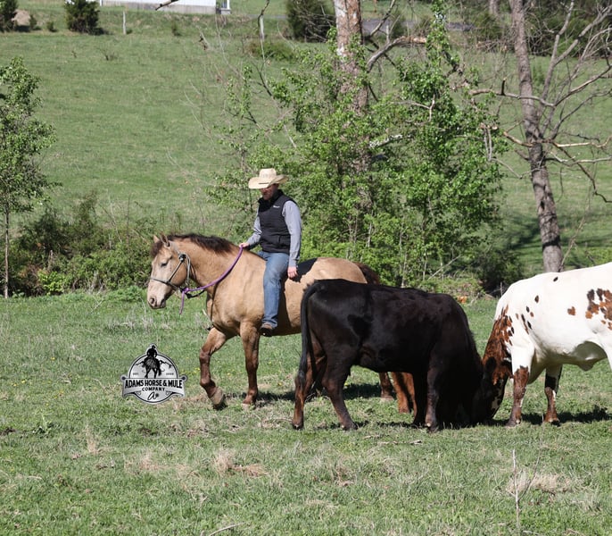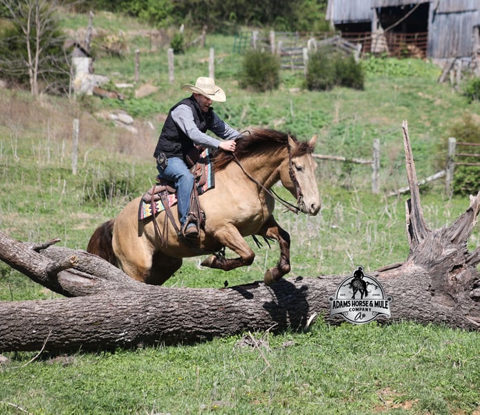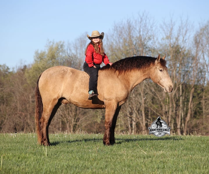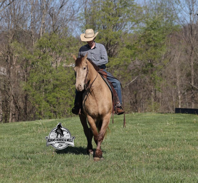 Go to visit our website for more pics and video link at www.AdamsHorseAndMuleCo.com AHAMC has been in the horse business and sold horses over the internet since 2005. We have a long track record of success with hundreds of happy customers. We work hard to match riders with the correct horses and specialize in beginner safe, family friendly horses that have been used and checked out by our family! We can set up transportation anywhere in the US and look forward to working with you. It’s time for a celebration… pop the champagne with this magnificent 15.2H+, ULTRA RARE Champagne Draftcross gelding! He is 6 years old and is VERY sturdy built. Jagger is one that is not only a rare color but rarely do we see one that is this beginner safe, a total confidence builder and one that is the PERFECT horse for the ENTIRE Family! He has been ridden by all ages including our kids. Jagger is one that does a little bit of everything… He’s been ridden around the ranch, checked cows and rode fences. Jagger is a trail riding machine!!! He is never in a hurry as he eases along down the trails, he will cross creeks, ditches, logs and navigate rough rocky areas. He picks the safest route and takes his time in tight situations. He has been exposed to all kinds of wildlife and has even packed will game out of the mountains. He is safe in traffic whether that be trucks or cars. He has a nice jog, his lope is smooth as well and he lopes nice circles! He is very well harness broke, pulls all farm implements and carriages as well. Jagger has been ridden English and geos over the rails with ease. This one horse that we can never say enough good things about and after he becomes part of your family your will agree! Feel free to call Eric 606-308-2461 with any questions!